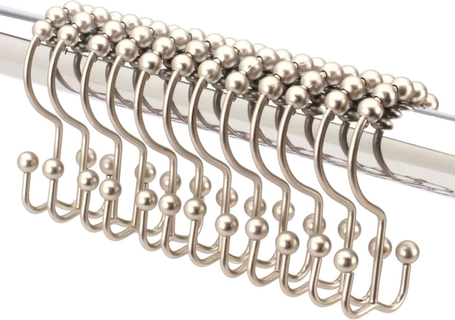 2lbDepot Double Sided Shower Curtain Hooks, Decorative Brushed Nickel Shower Curtain Hooks Rust Proof, Premium Stainless Steel Metal Hooks, Easy Glide Rollers, Set of 12 Curtain Rod Rings