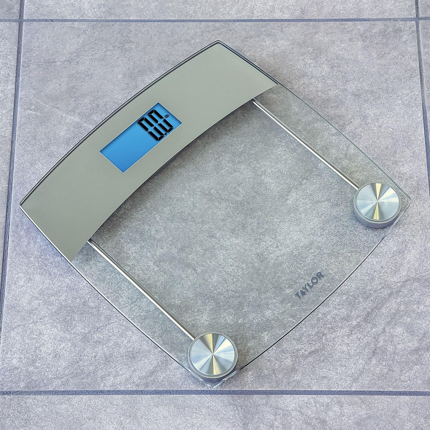 Taylor Digital Scales for Body Weight, Extra Highly Accurate 440 LB Capacity, Unique Blue LCD, Stainless Steel Accents GlassPlatform, 12.4 x 12.4 Inches, Clear