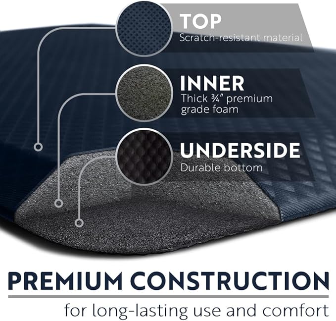 - THICK AND SUPPORTIVE CUSHIONING: extra thick, three quarter inch foam mat is extremely comfortable and engineered to help keep you supported; premium foam inner layer for strong rebound and maximum support; your feet will thank us later