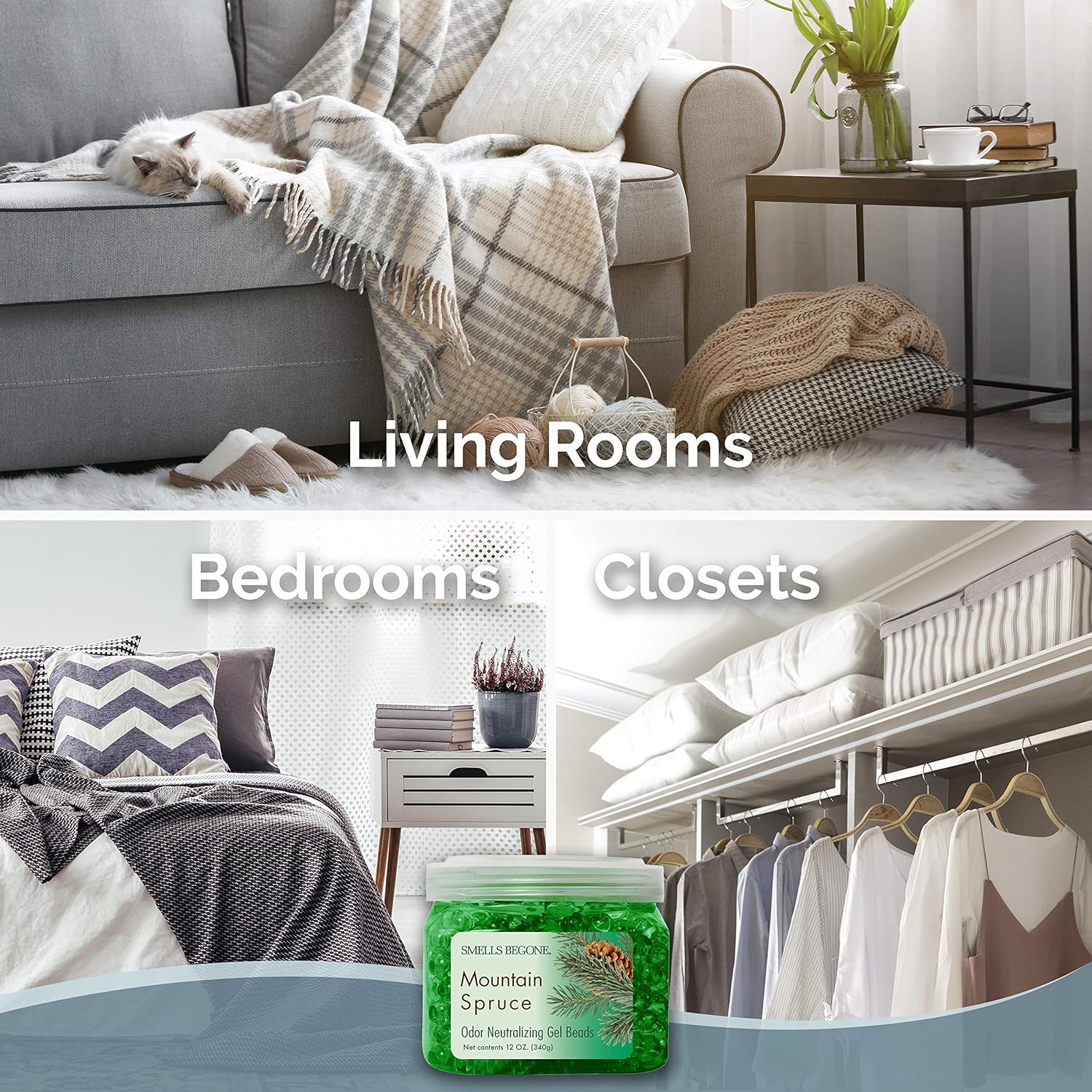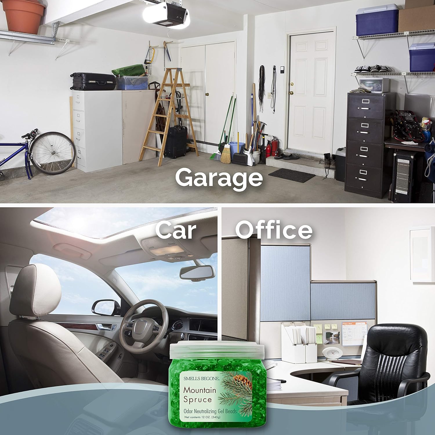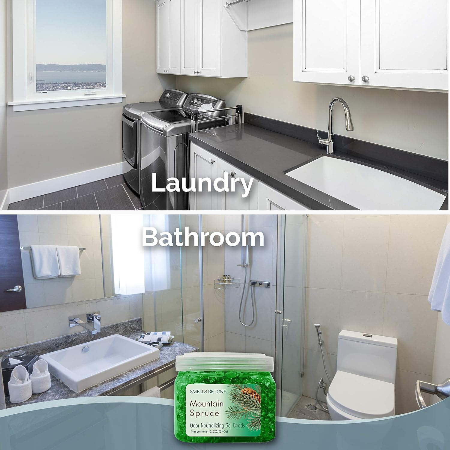 SMELLS BEGONE Odor Eliminator Gel Beads - Air Freshener - Made with Essential Oils - Eliminates Odors in Pet Areas, Bathrooms, Boats, RVs & Cars - Mountain Spruce Scent - 12 Ounce - 2 Pack