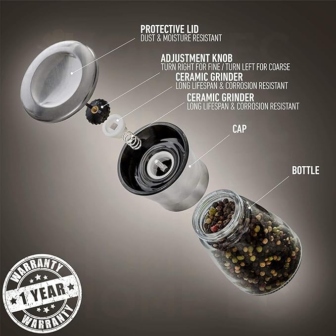 - Lifetime Warranty : All our salt mills and pepper mills go through rigorous inspection and testing to ensure our customers receive top quality grinder mills. We are confident you will enjoy our refillable spice grinder sets. In the unlikely event that your set is not to your standards, we will make it right for you, no hassle!