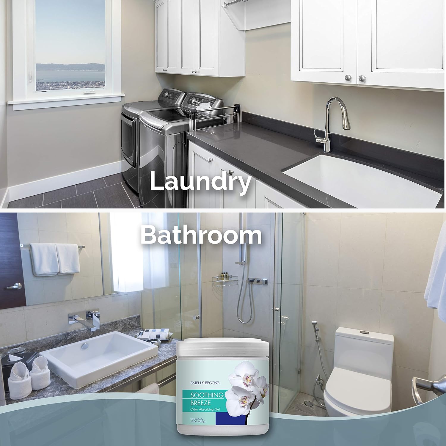 SMELLS BEGONE Air Freshener Odor Absorber Gel - 15 oz, Pack of 2 - Absorbs and Eliminates Odor in Pet Areas, Bathrooms, Cars, & Boats - Made with Essential Oils - Soothing Breeze Scent