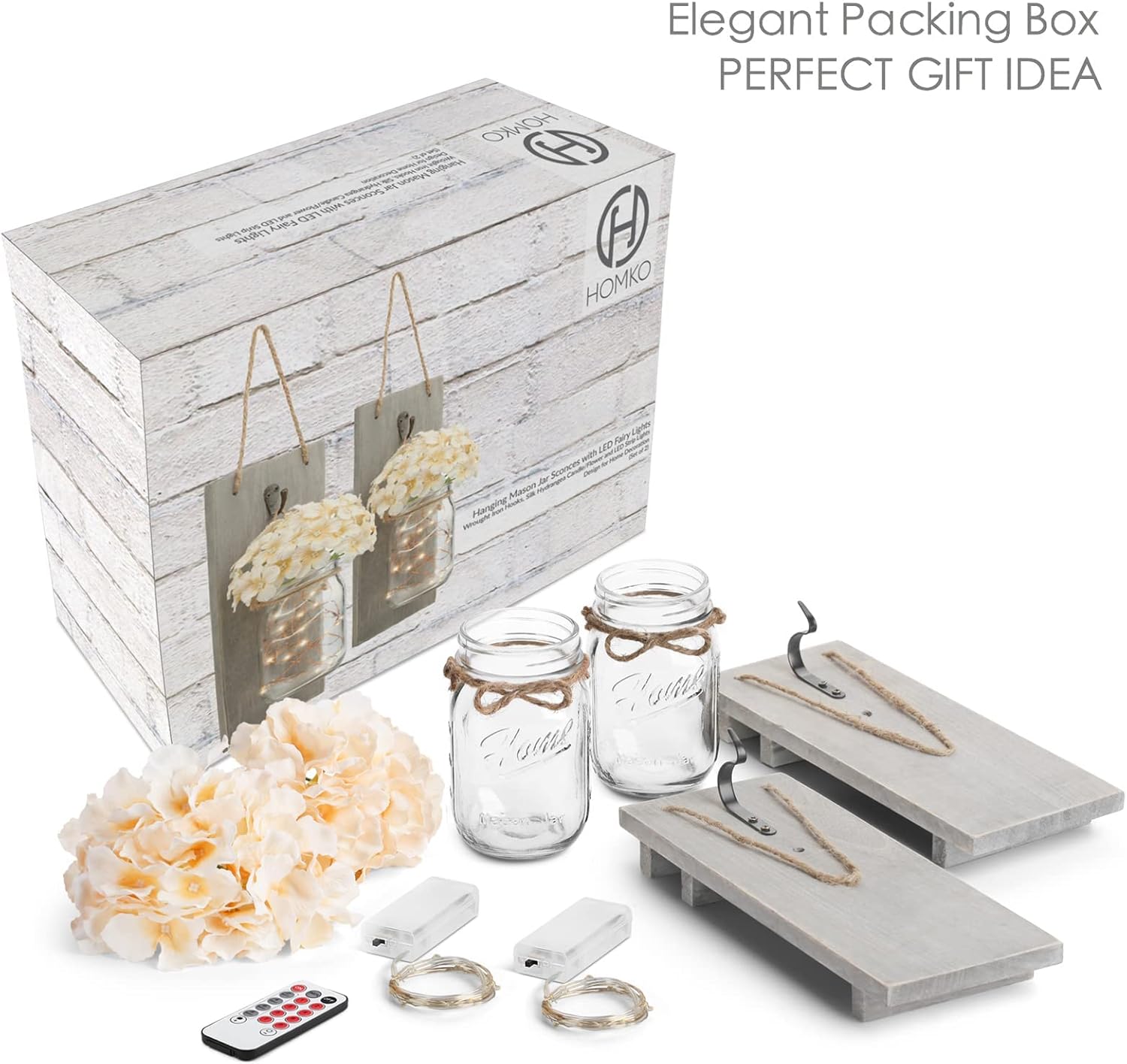 HOMKO Decorative Mason Jar Wall Decor - Rustic Wall Sconces with 6-Hour Timer LED Fairy Lights and Flowers - Farmhouse Home Decor (Set of 2)