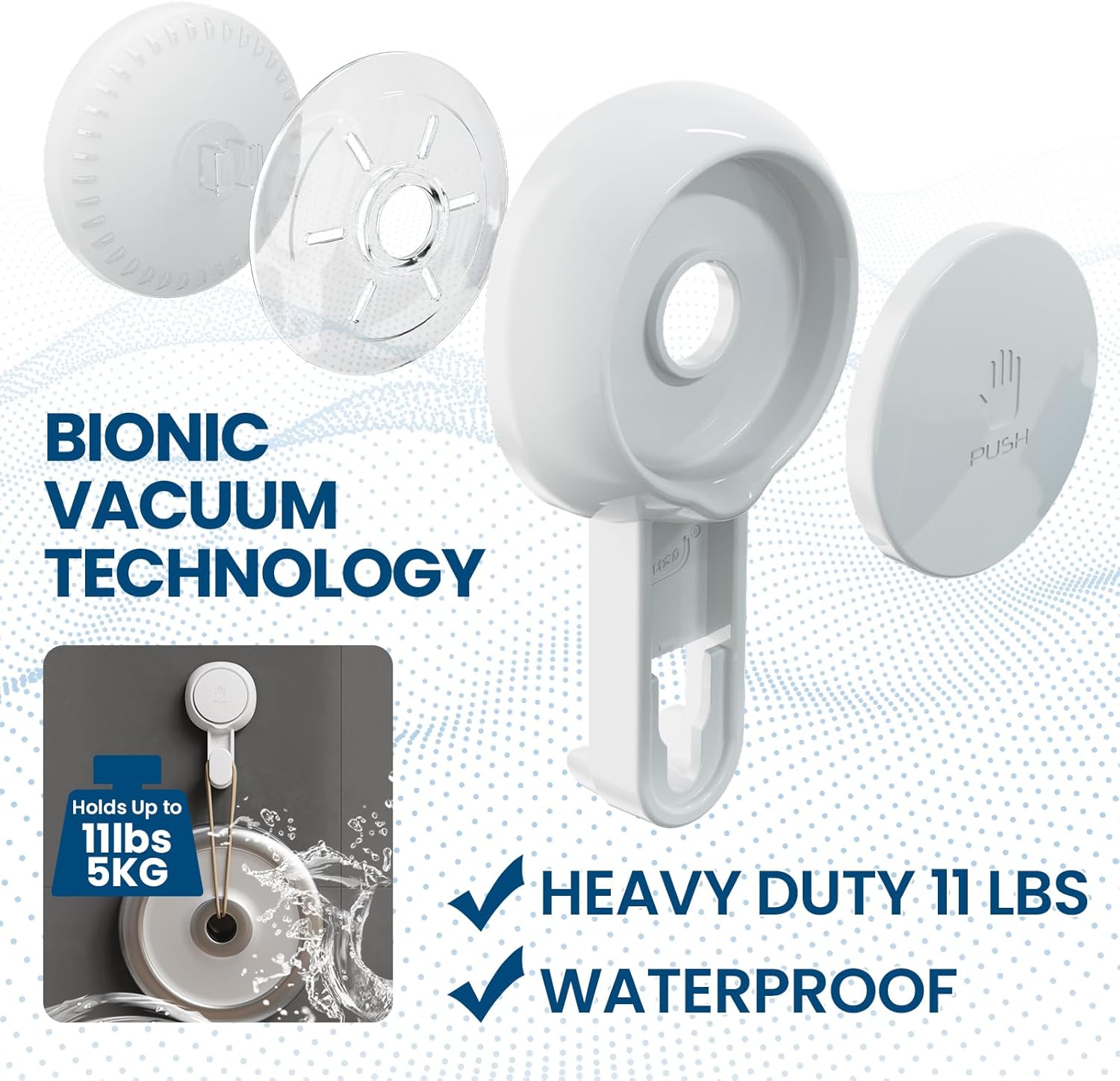 - Powerful suction cup: Inspired by the tentacles of octopus, the shower holder suction cup applied the new bionic technology to ensure waterproof, oil-proof and anti-aging. The towel hook with thicken plastic suction can hold up to 11 lbs and stick sturdily for years, available to remove and reinstall it in a new surfaces