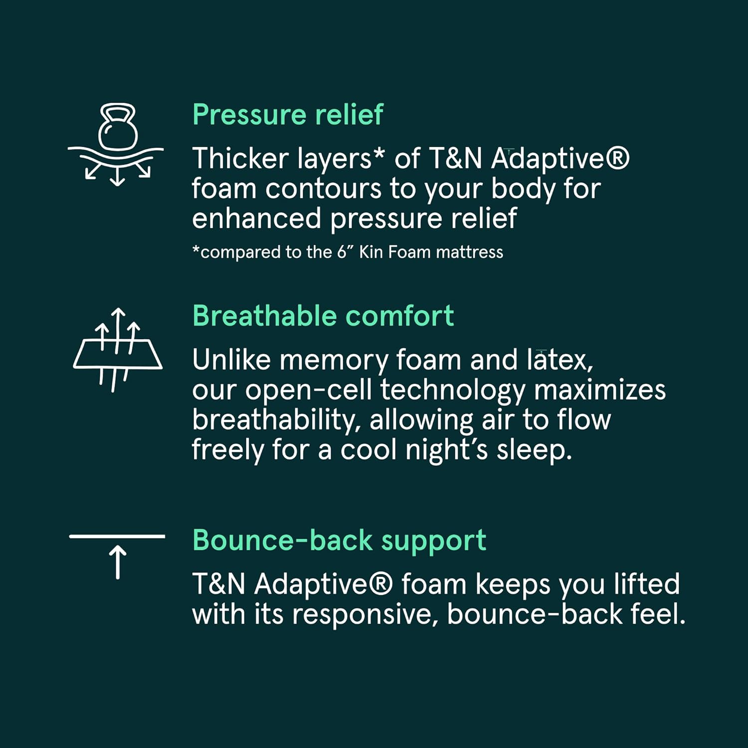 - Breathability and Bounce-Back support β our open-celled T&N Adaptive foam maximizes breathability, support, and pressure relief. T&N Adaptive foam is designed to feel more supportive than memory foam and latex and help you sleep cooler all night