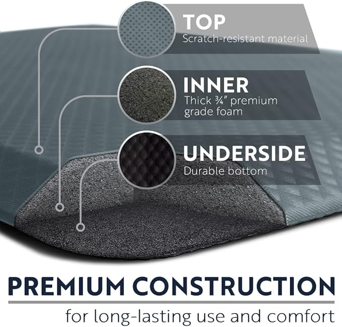 - THICK AND SUPPORTIVE CUSHIONING: extra thick, three quarter inch foam mat is extremely comfortable and engineered to help keep you supported; premium foam inner layer for strong rebound and maximum support; your feet will thank us later