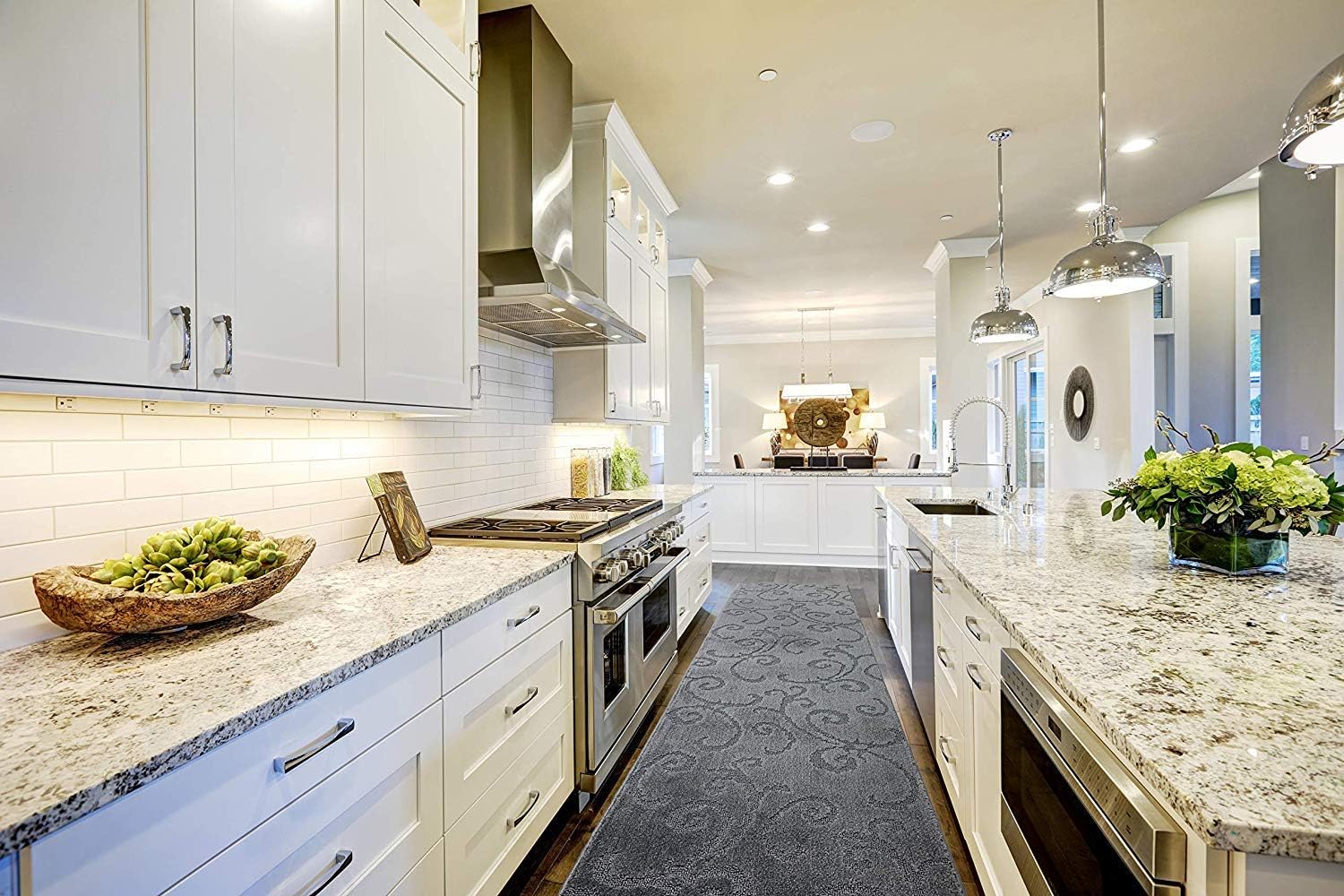 - Color and Shipping : All custom runner rugs are carefully rolled and NOT FOLDED to prevent creasing during shipment and lay flat when opened. This kitchen runner rug is an anthracite grey color. Actual colors may vary. We do our best to ensure that our carpet runner rug photos are as true to color as possible. This is a great addition to any home décor with minimal maintenance required.