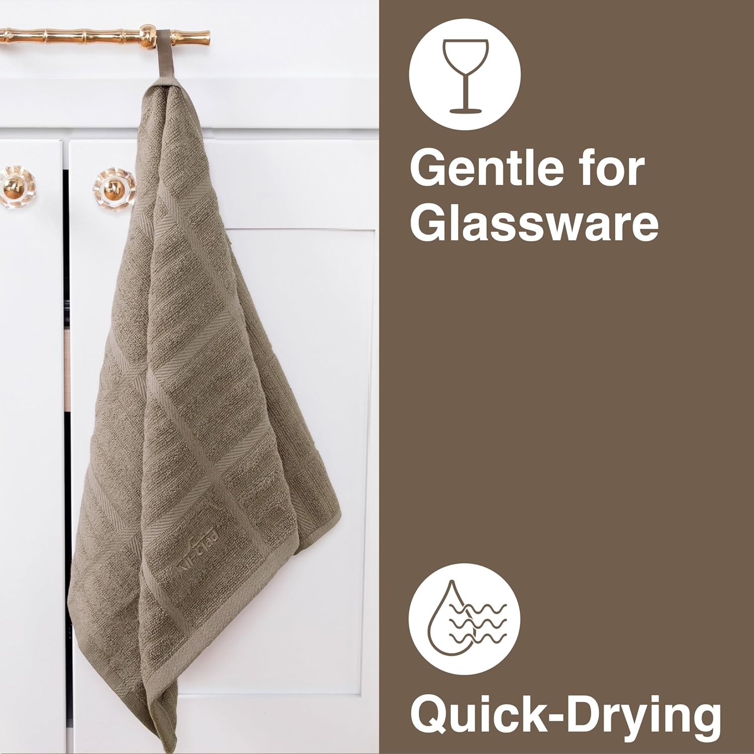 - 100% COMBED COTTON. Extra soft pre-washed, yarn-dyed cotton with finished stitched hems. Made of highly absorbent soft cotton that makes them great for drying dishes and glassware and cleaning up spills around the kitchen