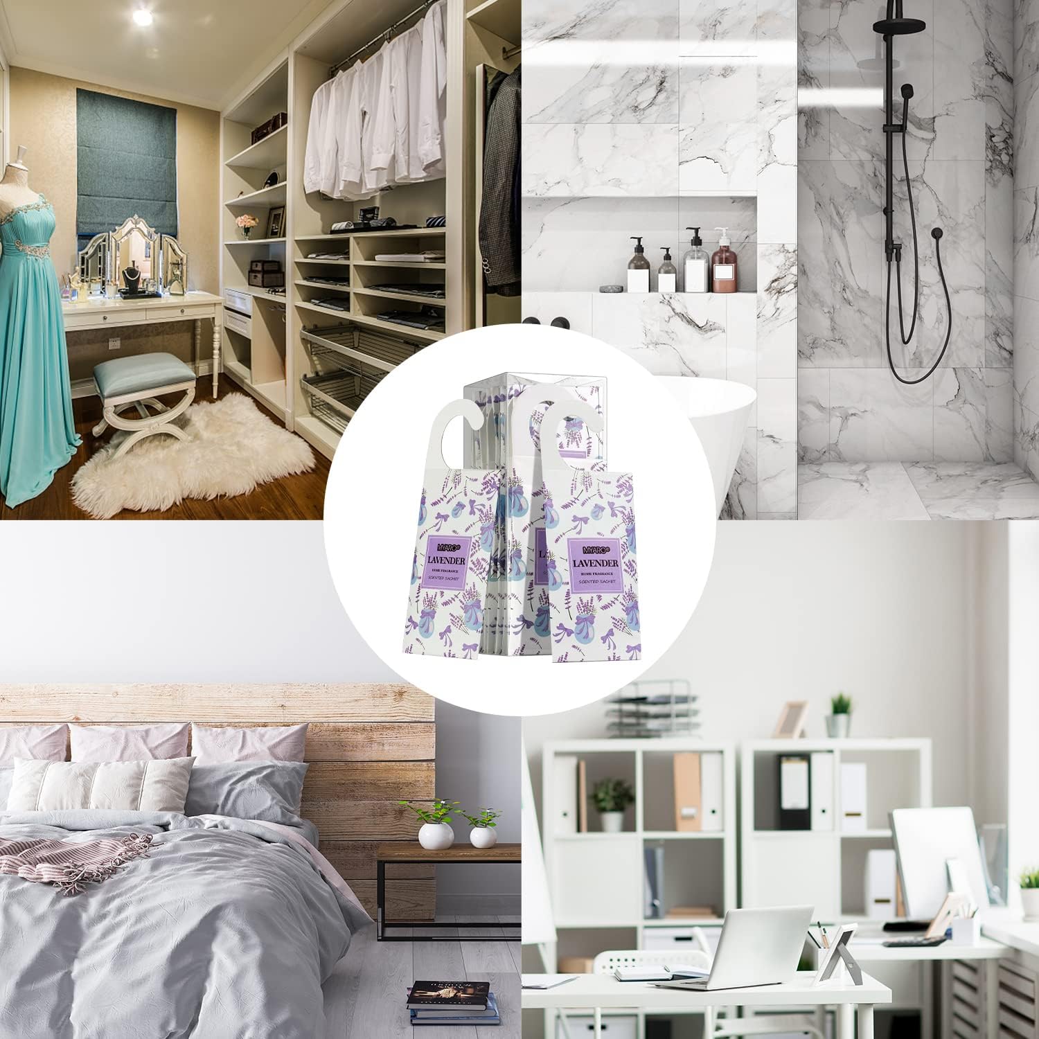 - Multi-Purpose Air Freshener - Large sachets are better for large space air fresheners than small ones, but with air circulation, the scent will be weaker. You can use the closet deodorizer hanging in closets, drawers, gym bags,suitcases, pillows and storage boxes, hanging fragrance for bathroom or in your linen wardrobe