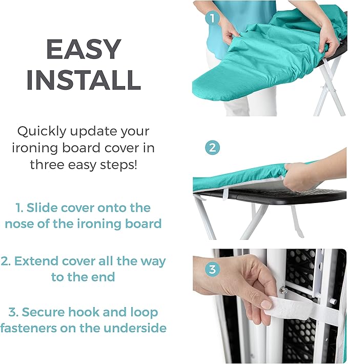- Stays In Place: cover features a nose pocket, hook and loop fasteners and elastic edges to help keep it in place and prevent shifting while ironing; includes not one but two hook and loop fastener straps on the underside and strong elasticized edges around the entire border