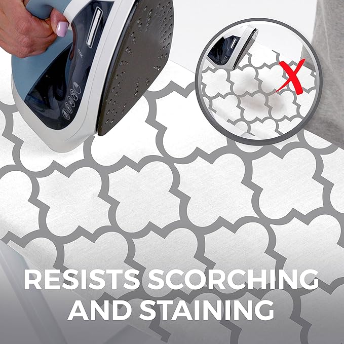 HOME GENIE Ironing Board Cover, Silicone Coating, Full Size Scorch Resistant Padding, Elastic Edge Heavy Duty Iron Pad Covers Standard Boards, Hook and Loop Fastener Strap Extra Thick, Quatrefoil Gray