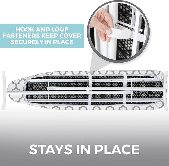 - Stays In Place: cover features a nose pocket, hook and loop fasteners and elastic edges to help keep it in place and prevent shifting while ironing; includes not one but two hook and loop fastener straps on the underside and strong elasticized edges around the entire border