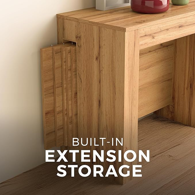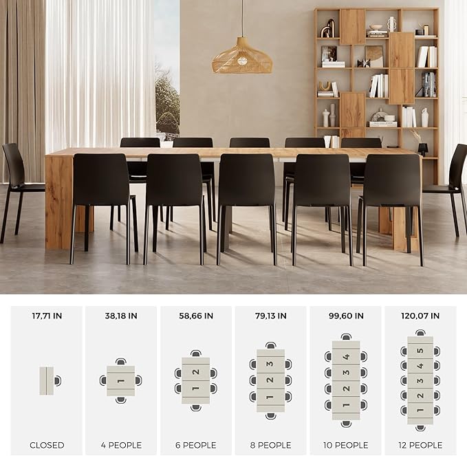 - WHY TO CHOOSE?: The Easy extendable console table is the ideal space saving dining table, transforming from a compact 17.7 in to 120 in, comfortably seating up to 12 people. Itβs easy to assemble, incredibly sturdy, and built to handle lively meals and gatherings. The integrated storage for extensions keeps your space neat, while its sleek design fits perfectly in any modern home. A must-have for those seeking a transformable table that maximizes both space and style.