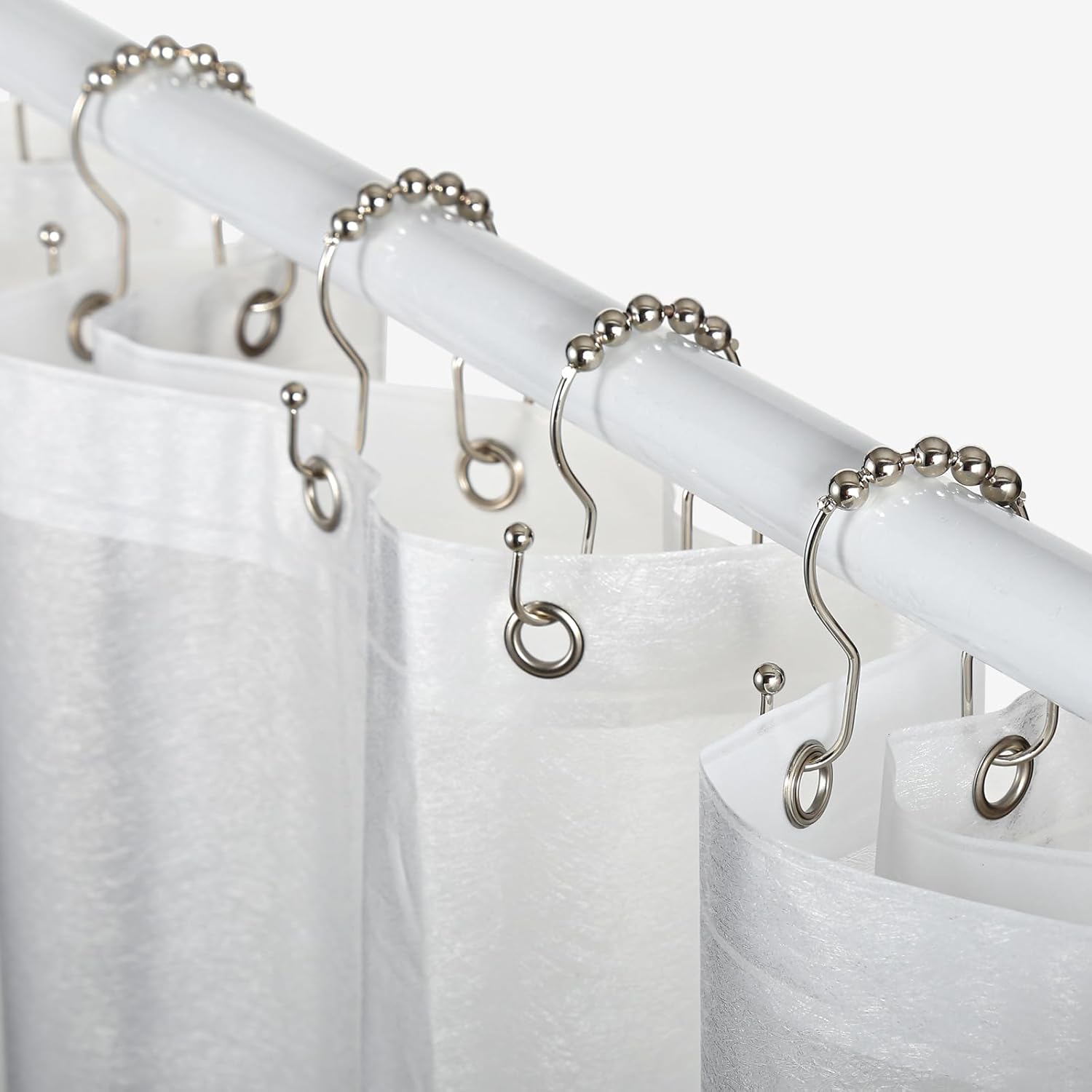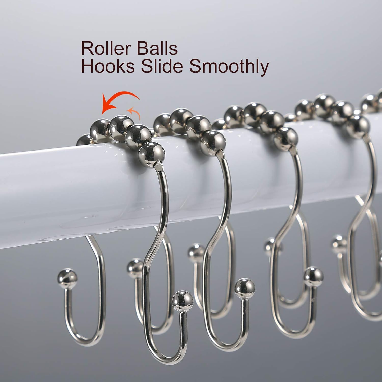 - [DOUBLE SHOWER HOOKS]: The double shower rings for curtain are made by exquisite craft. The obstacle on both sides fix the roller balls to keep balance, which prevent shower curtain from falling off, it's strong enough to hold both heavy curtain and liner.