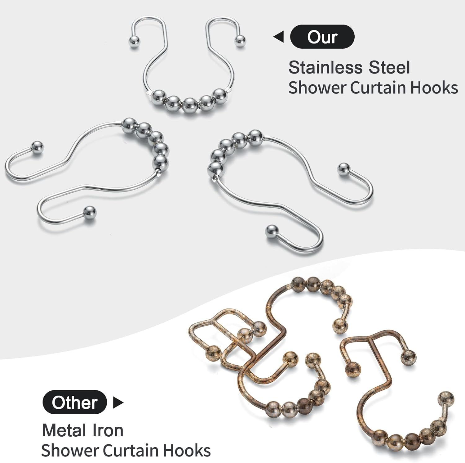 - [RUSTPROOF STRUCTURE]: The shower curtain hooks are made of stainless steel with an electroplating process to resist rust and corrosion, perfect for bathroom environment.