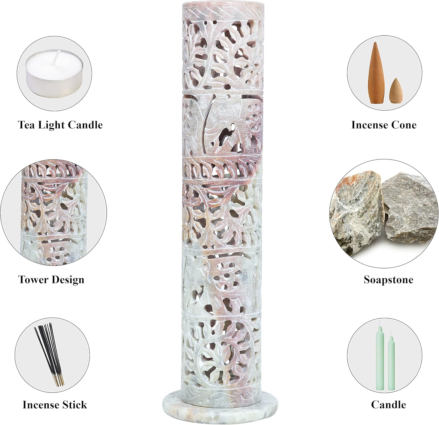 Crocon Soapstone Handmade Tower Candle Burner Elephant Leaf Crafting Incense Tower Burner | Tea Light Holder | Living Room Decor Kitchen Home Fragrance Decorative Great Gift Set - 2.9X2.9X10 Inch