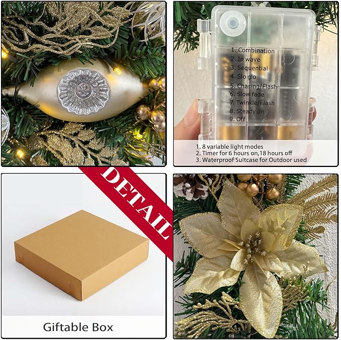 - ①【Gold Tale Theme】-This is a magnificent christmas!A fabulous and golden atmosphere for the end of the year,where our family will be amazed.In the dazzling christmas wreath shine classic elements such as champagne ornaments ,glitter peacock tales.We discover a discreet glitter ball with a star pattern, a gold-covered onion shape christmas balls ornaments we skillfully mix a elegance revisited atmosphere with a touch of traditional, for a sophisticated and luxuriant christmas