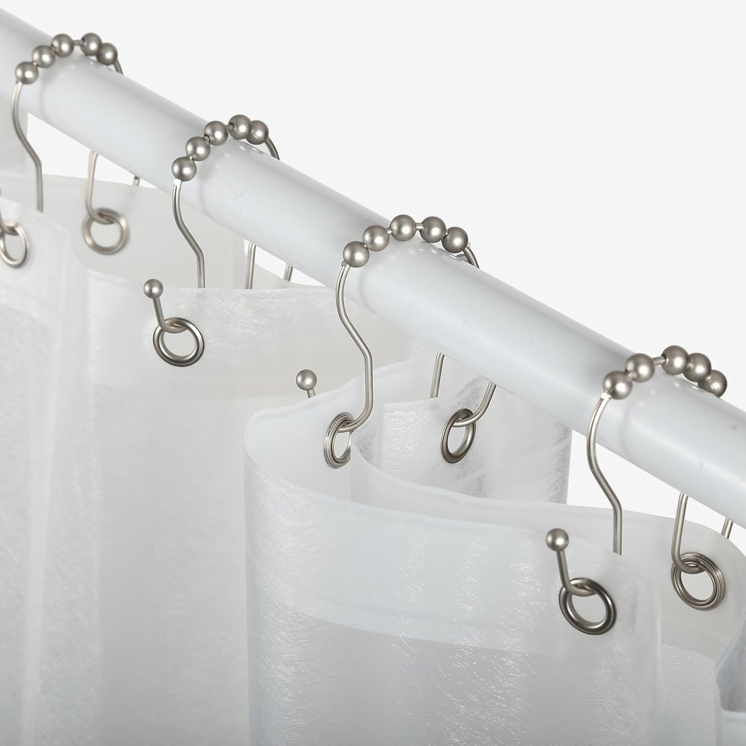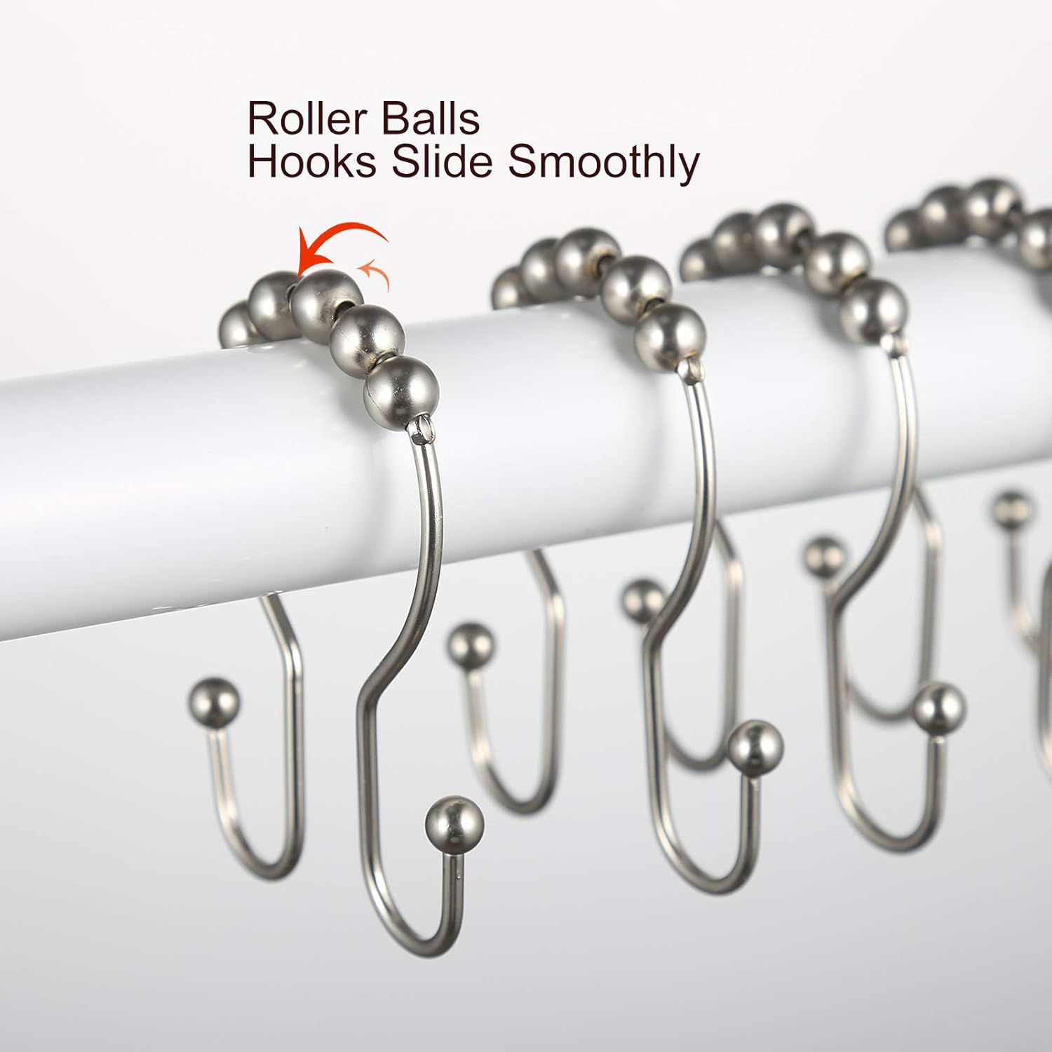 - [DOUBLE SHOWER HOOKS]: The double shower curtain hooks rust proof are made by exquisite craft. The obstacle on both sides fix the roller balls to keep balance, which prevent shower curtain from falling off, it's strong enough to hold both heavy curtain and liner.