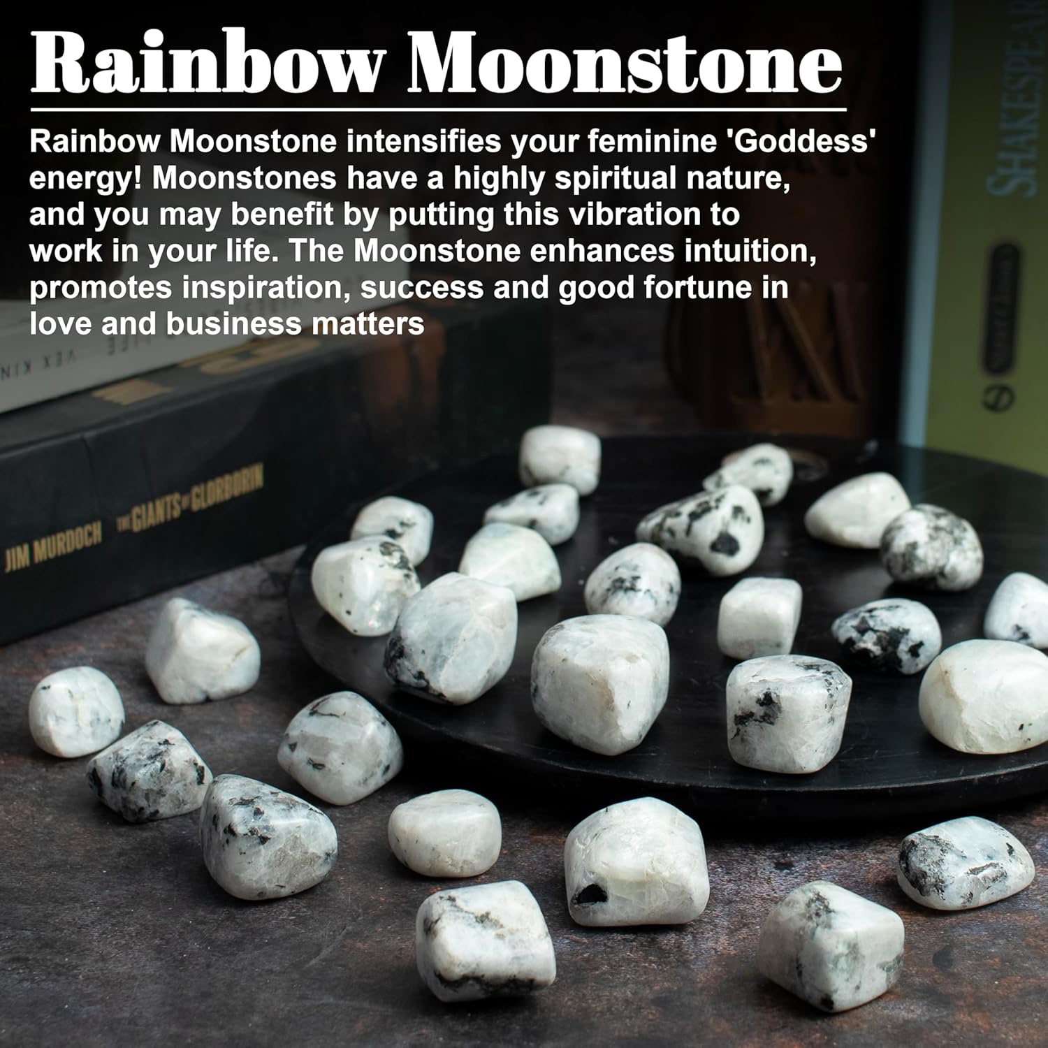 - Tumbled stones : These lovely Rainbow moonstone tumble stones are handcrafted in India. The set contains a bunch of 1 LB tumbled stones with a pouch, a crystal guide and a Thank you card. Perfect for crafts, home decor, lapidary, cabbing, and cutting.