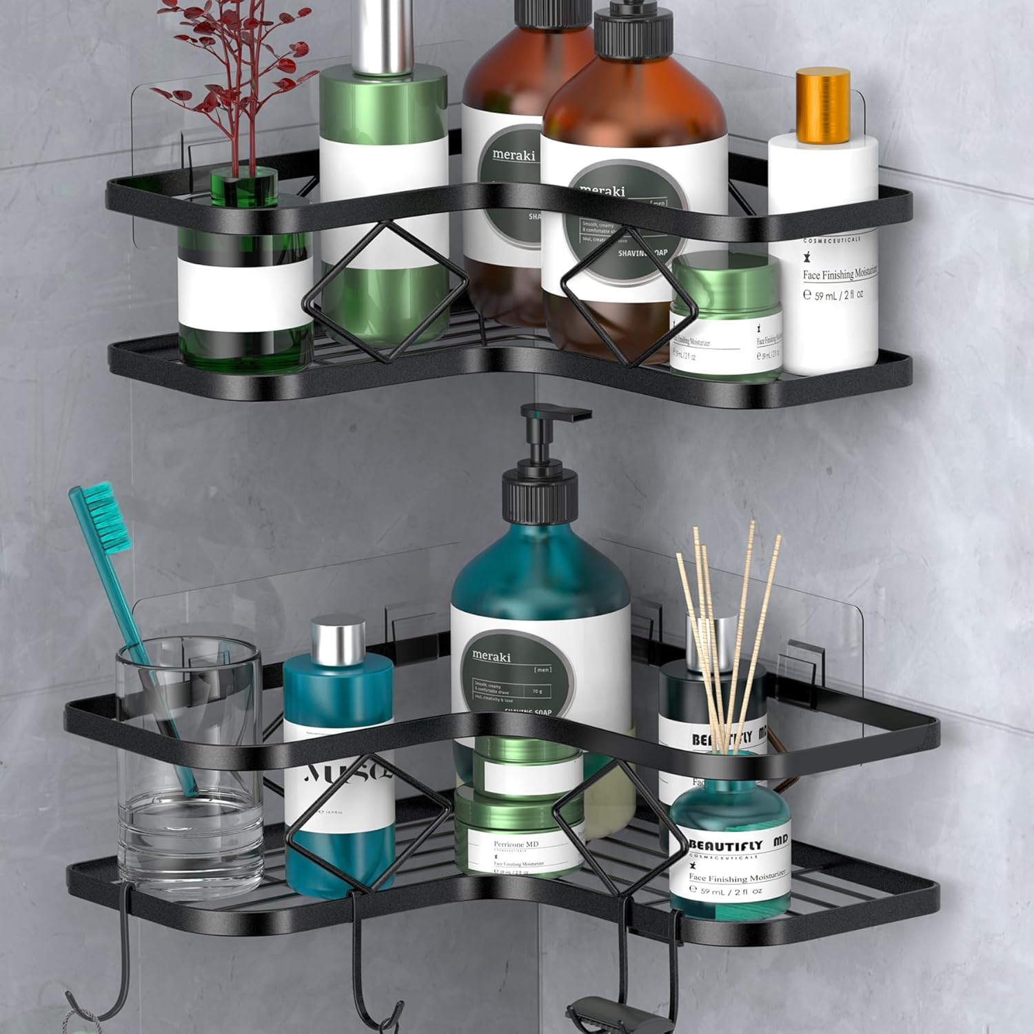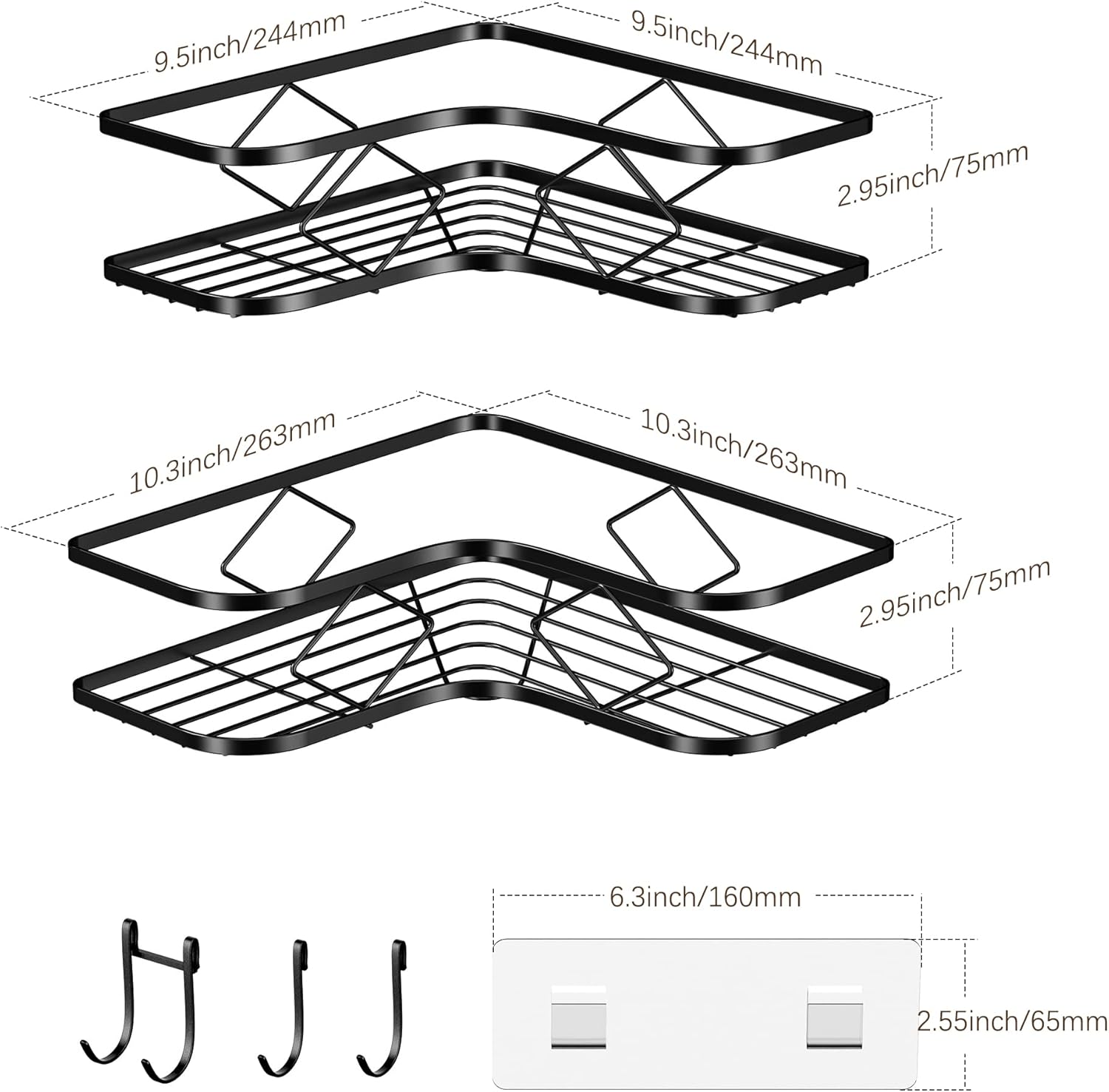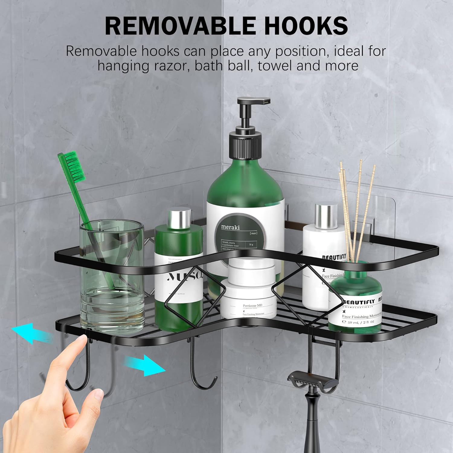 - NO DRILLING & NO DAMAGE: The shower corner shelf with the powerful adhesive hooks to ensure the shower organizer stable, it's very easy to install. Just stick it to your wall and then put your shelves on the hooks, waiting for 12 hrs and finally put your bathroom shower accessories on the shelve.