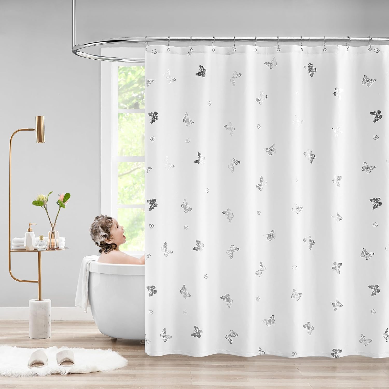 Jubilantex Butterfly Shower Curtain for Bathroom, White Silver Print Farmhouse Waterproof Bathroom Decorative Rustic Kids Shower Curtain with 12 Rust Proof Grommets for Spa Hotel, 70x72 Inches