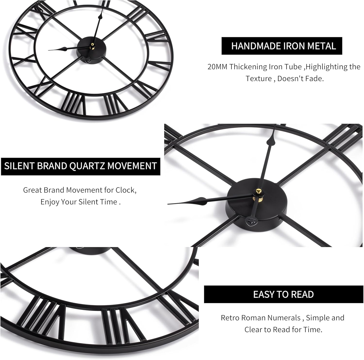 - [Industrial Clock] The large metal clock has a hollowed-out retro design. The strength and retro appearance of the Roman wall clock are ensured by the use of high-quality materials in the handcrafted, solid iron frame.