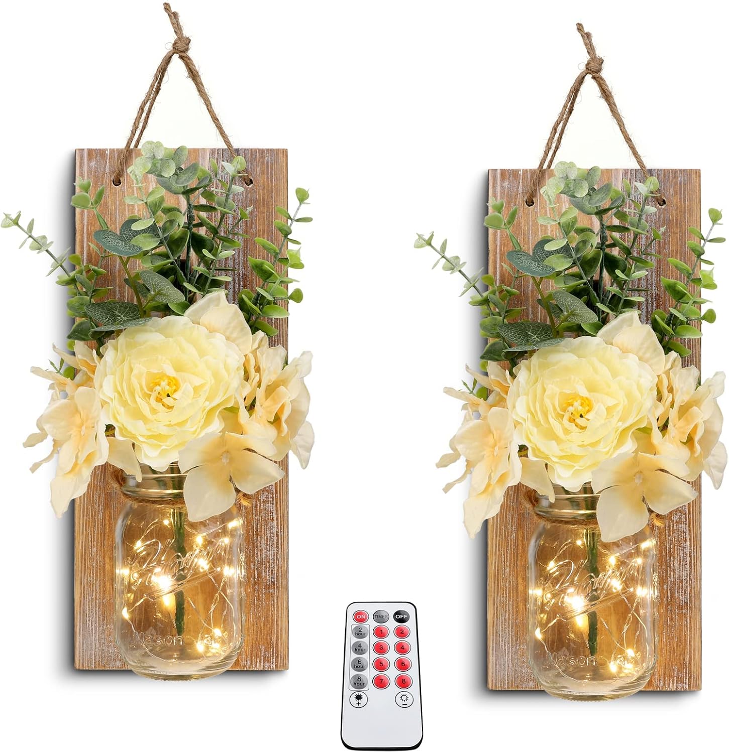 HOMKO Rustic Wall Decor, Mason Jars Wall Sconces, with Remote Control LED Lights and Flowers, Hanging Rural Farmhouse Kitchen Bathroom Bedroom Living Room Home Decor (Set of 2) -Rustic Brown