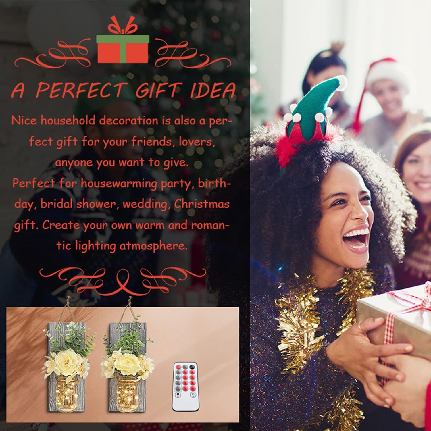 - 【High-quality Materials & Perfect Gift Idea】This farmhouse wall decor with multi-mode LED fairy strip lights is made from exquisite craftsmanship by using high-quality materials. This rustic mason jar sconces set is also an ideal gift as anniversary gift, birthday gift, Christmas gift and wedding gift for your friends, family and anyone you want to give.