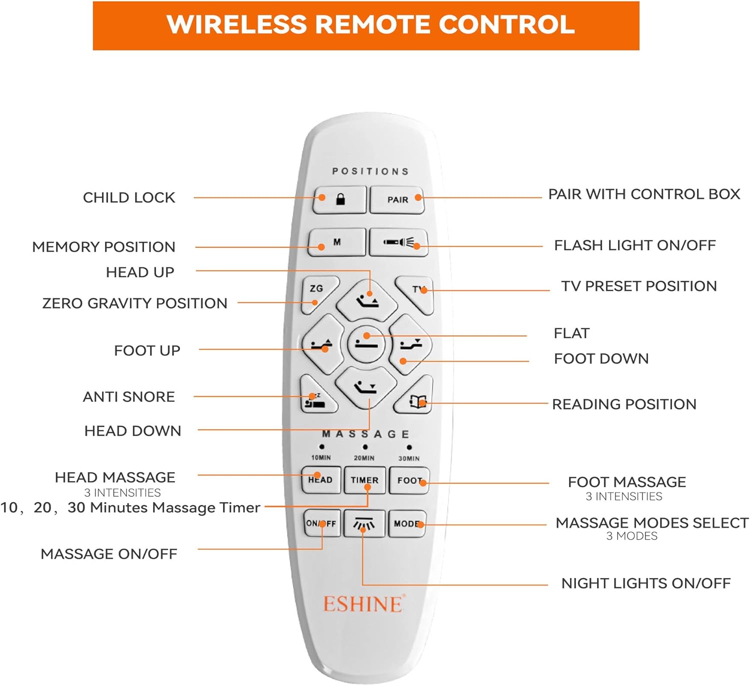 - 👨👩👦WIRELESS REMOTE & EASY TO INSTALL - Wireless remote in this adjustable smart bed owns 19 buttons which can meet all functional needs, such as watching TV position, massage, and anti-snore sleep. Easy Installation will be in 10 minutes.