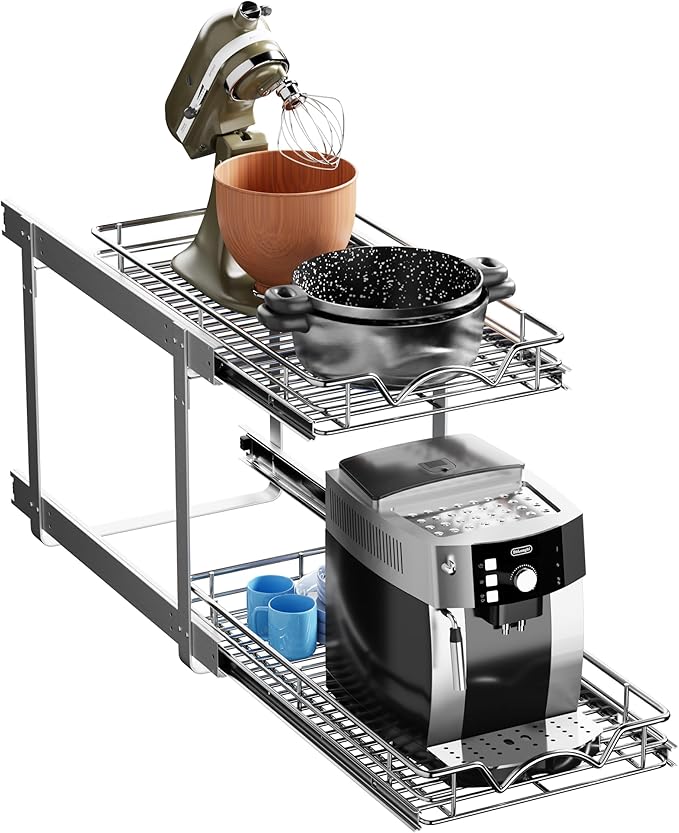 - 2-TIER PULL OUT CABINET ORGANIZER: Maximize kitchen space with dual pull-out shelves that slide independently for full-extension access. Easily organize cookware, pantry items, or cleaning supplies in hard-to-reach cabinets.