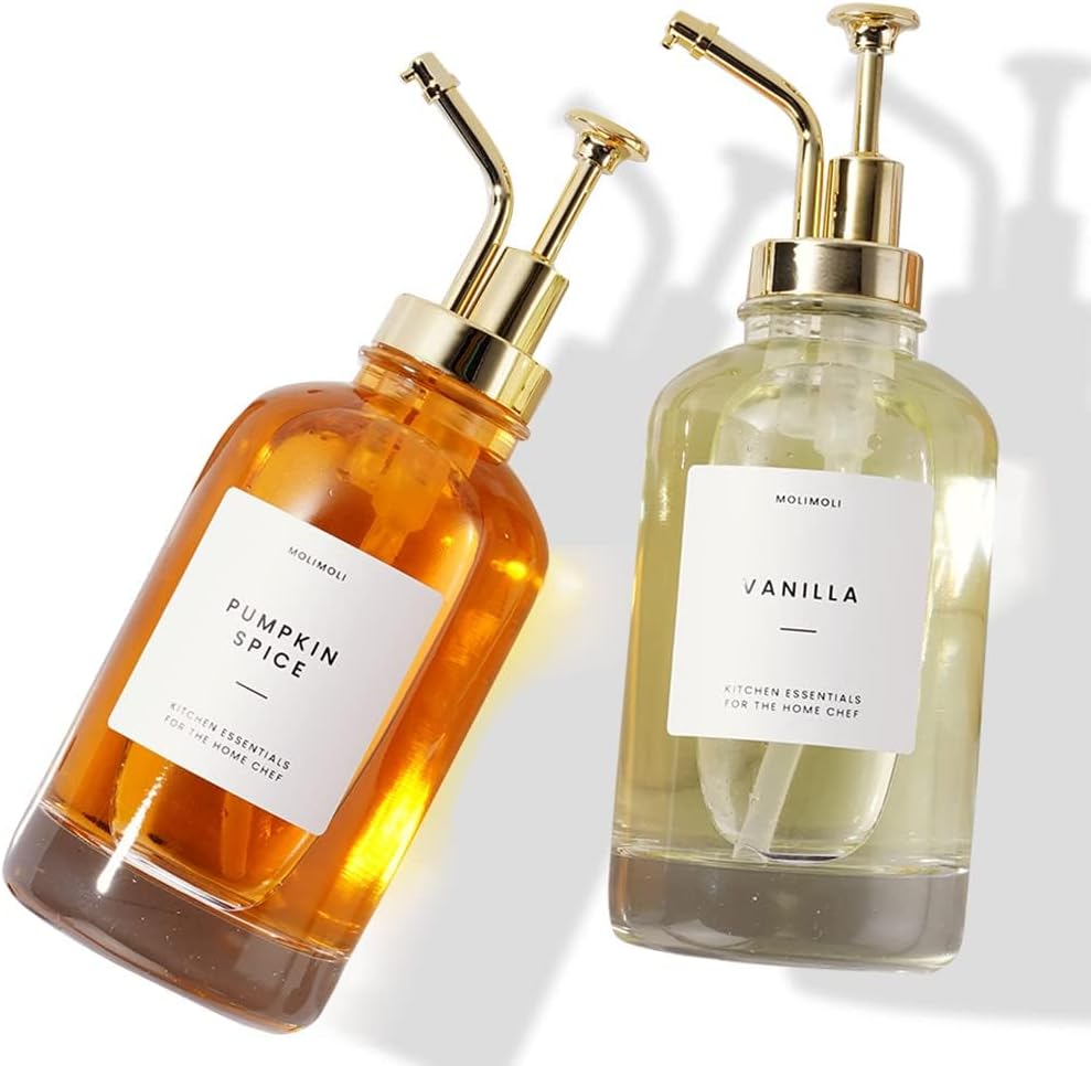 Molimoli Syrup Dispenser for Coffee Bars, Glass Syrup Bottle w. Pump, 16.9 oz 500 ml, Set of 2, Gold Upgraded Dispenser