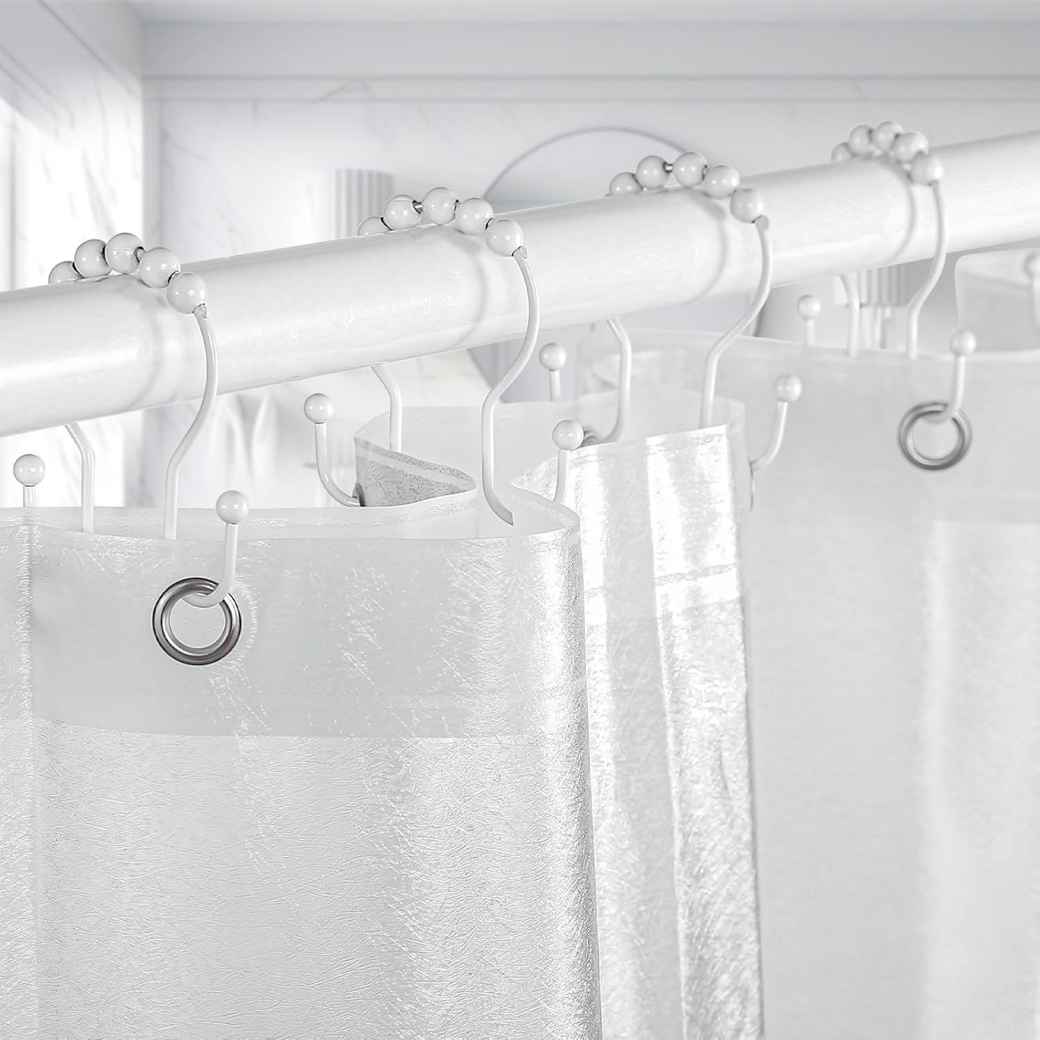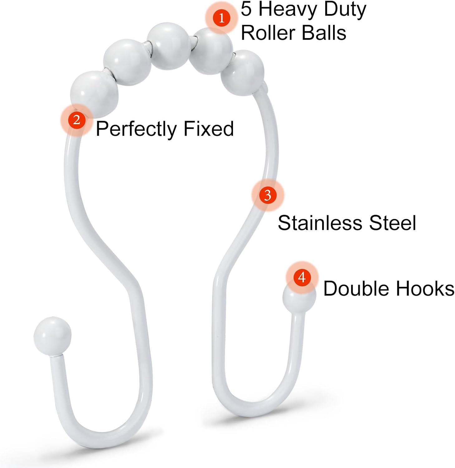 - [DOUBLE SHOWER CURTAIN HOOKS]: The shower curtain rings rust proof are made of exquisite craft. The obstacle on both sides fix the roller balls to keep balance, which prevents the shower curtain from falling off, it's strong enough to hold both the heavy curtain and liner.