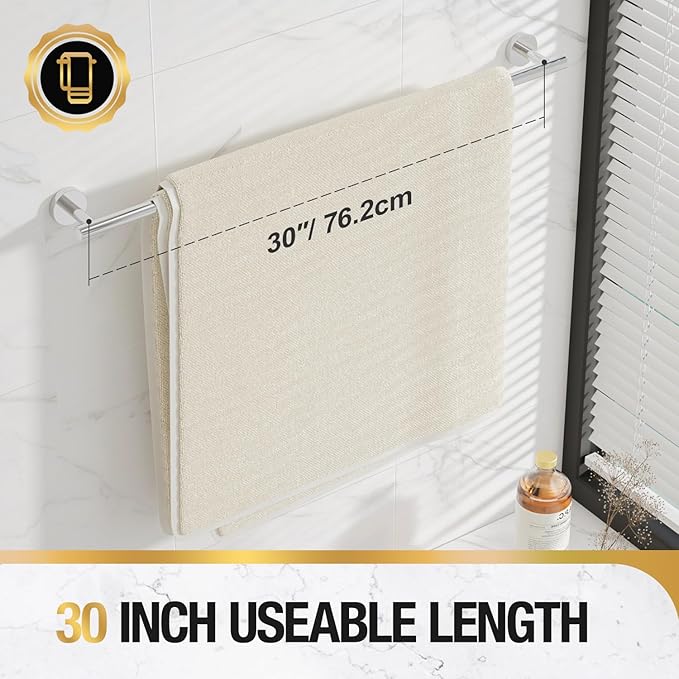 - 30 Inch Useable Dimension: The useable length of hanging the towel is 30 inch. Total length of towel bar is 31.6 inch. It is recommended to hang 1 bath towel or 2 hand towels or 2 washcloths.