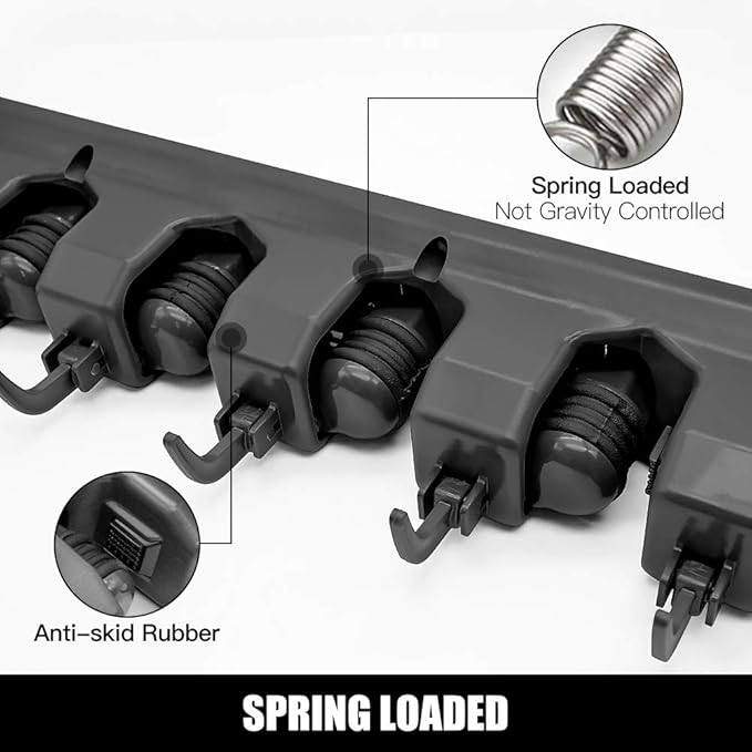 - Spring Loaded: Special spring clips design with rolling rubber ball that make sure the broom and mop will not fall out,including wet mop, dirty rakes, stick vacuum and other heavy stuff