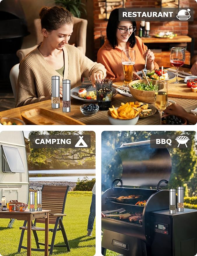- Suitable for Most Spices and Perfect Gift: The ceramic grinding core does not absorb odors, it can easily grind pepper, salt and other solid grain seasonings. This grinder is the good helper for kitchen, restaurant, party and outdoor picnic. Together with a simple style of design and fine box, this automatic salt and pepper grinder set is a thoughtful gift for wedding, birthdays, Mother’s Day, Father’s Day, Anniversary, Christmas and New Year.