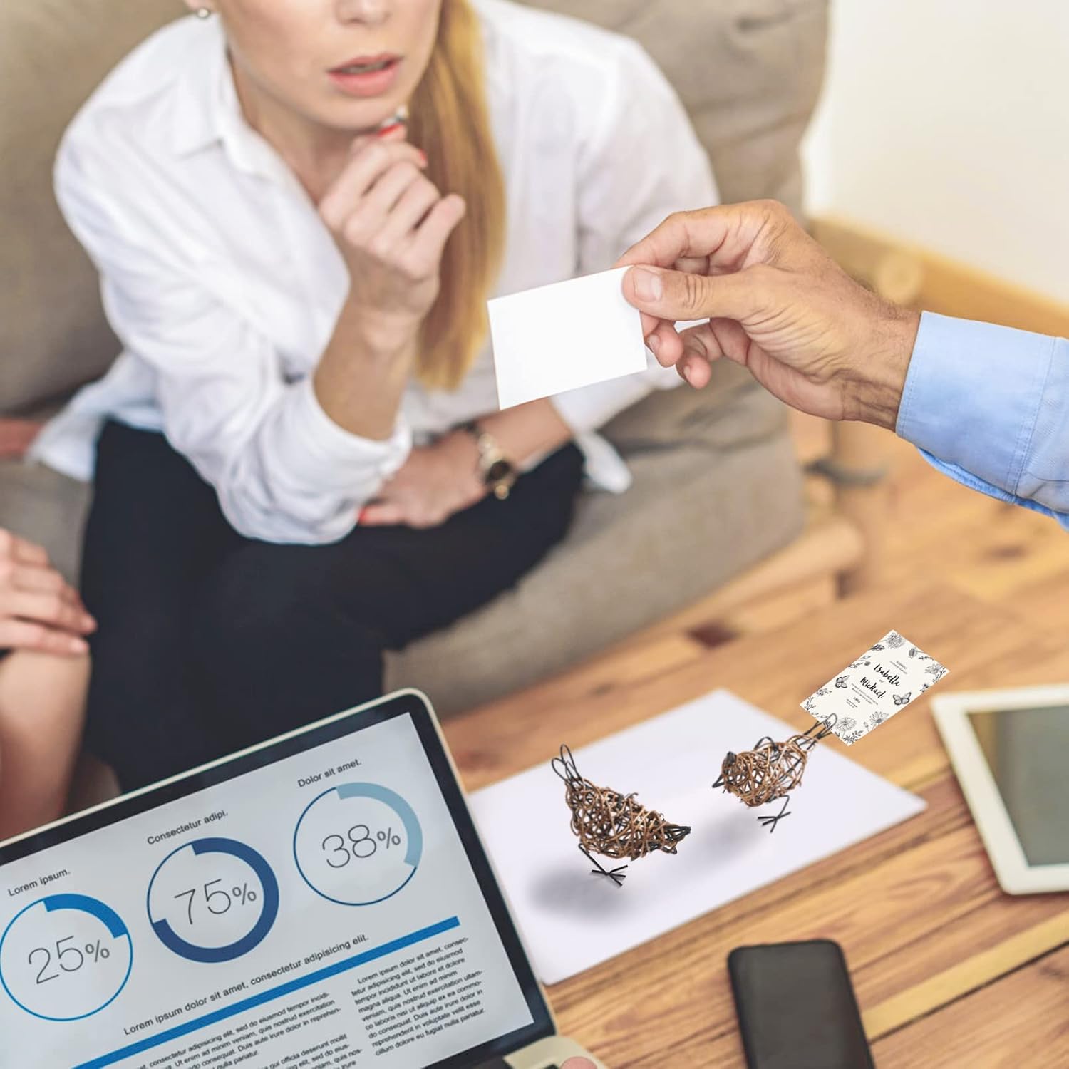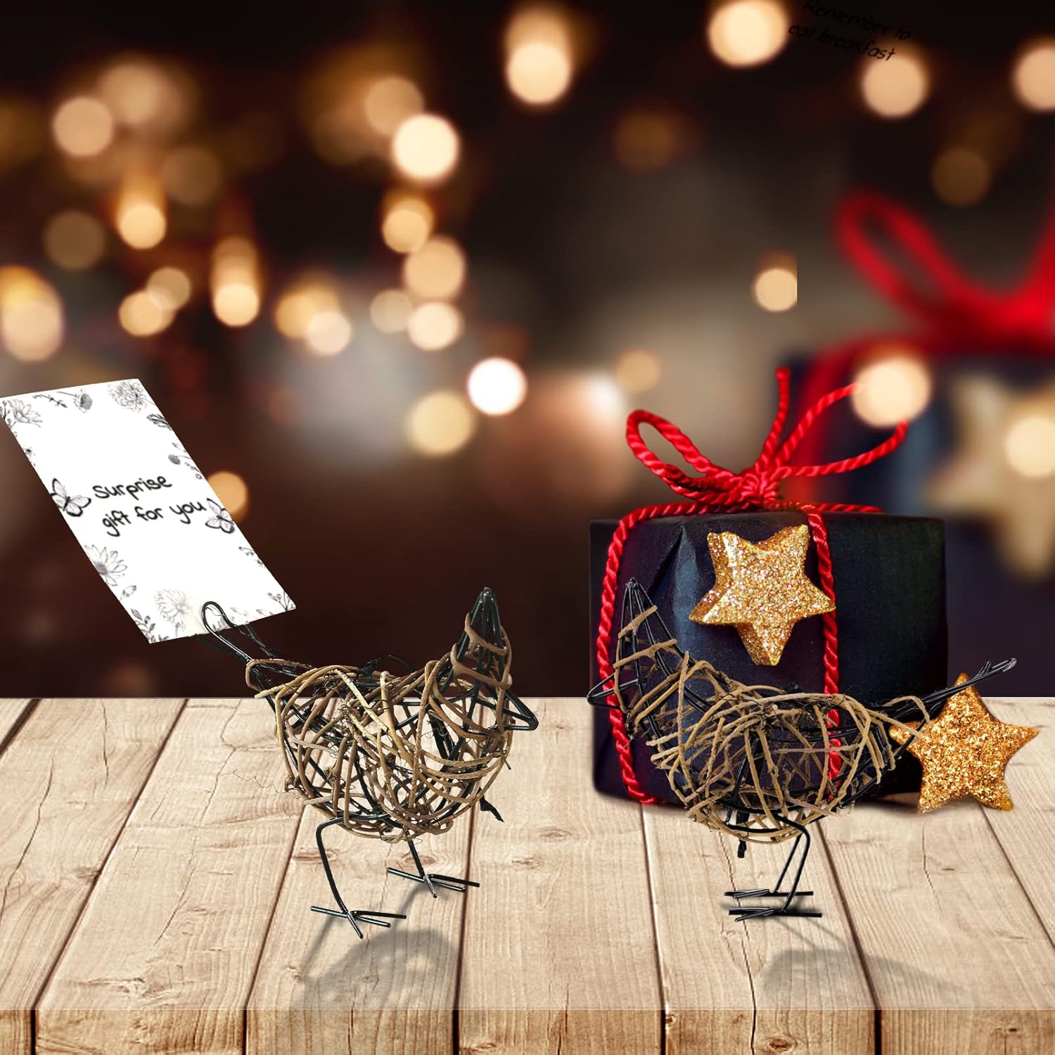 Natural Rattan Bird Sculptures Set of 2 - Handwoven Metal Wire Table Decor, Rustic Farmhouse Accent with Memo Clip & Christmas Ornament (6x5.5x2.3in)