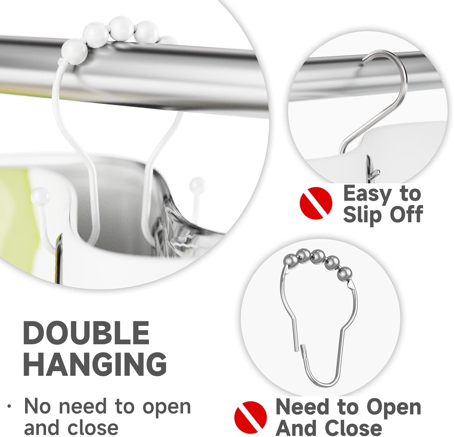 - Double hooks for hanging: These shower curtain hooks are double-sided designs, both sides can hang things and keep balance. The shower curtain and the liner can be hung together at the same time and are not easy to fall off.