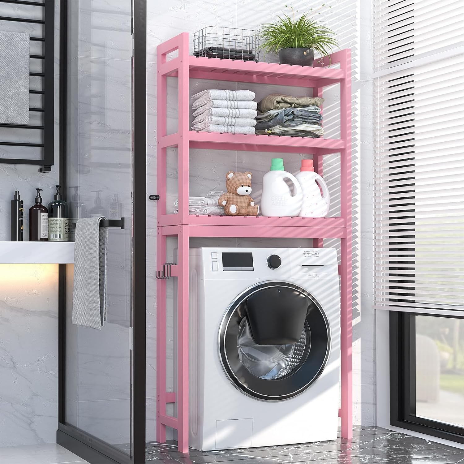Homykic Bamboo Over The Toilet Storage Shelves, 3-Tier Above Toilet Storage Organizer Rack with 3 Hooks, Freestanding Bathroom Tower Shelf Unit for Small Space, No Rust, Easy to Assemble, Pink