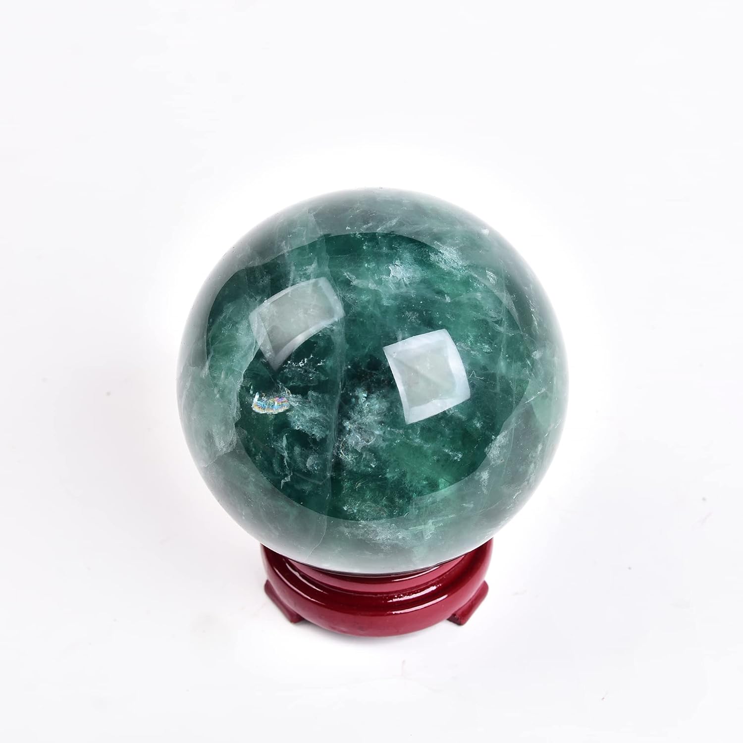 - Natural Crystal Sphere:About 3.5-3.9"(90-100mm).Material:100% Natural green fluorite stone,with a wood stand. hand made and polished,so each is unique and one of a kind,some may come with small chips or imperfections.Any appearances of cracks are one of the natural characteristics of this crystal or mineral and not because of damage