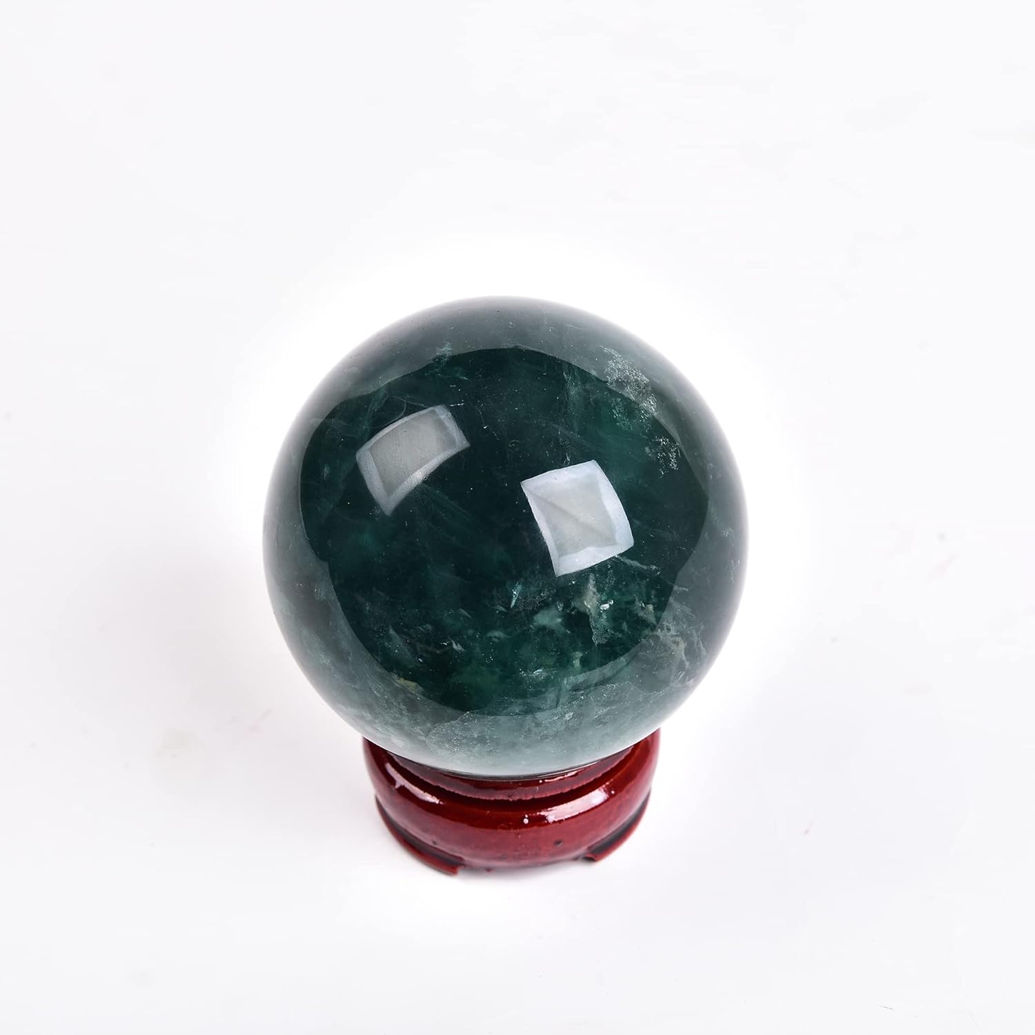 - Natural Crystal Sphere:About 2.3-2.7"(60-70mm).Material:100% Natural green fluorite stone,with a wood stand. hand made and polished,so each is unique and one of a kind,some may come with small chips or imperfections.Any appearances of cracks are one of the natural characteristics of this crystal or mineral and not because of damage
