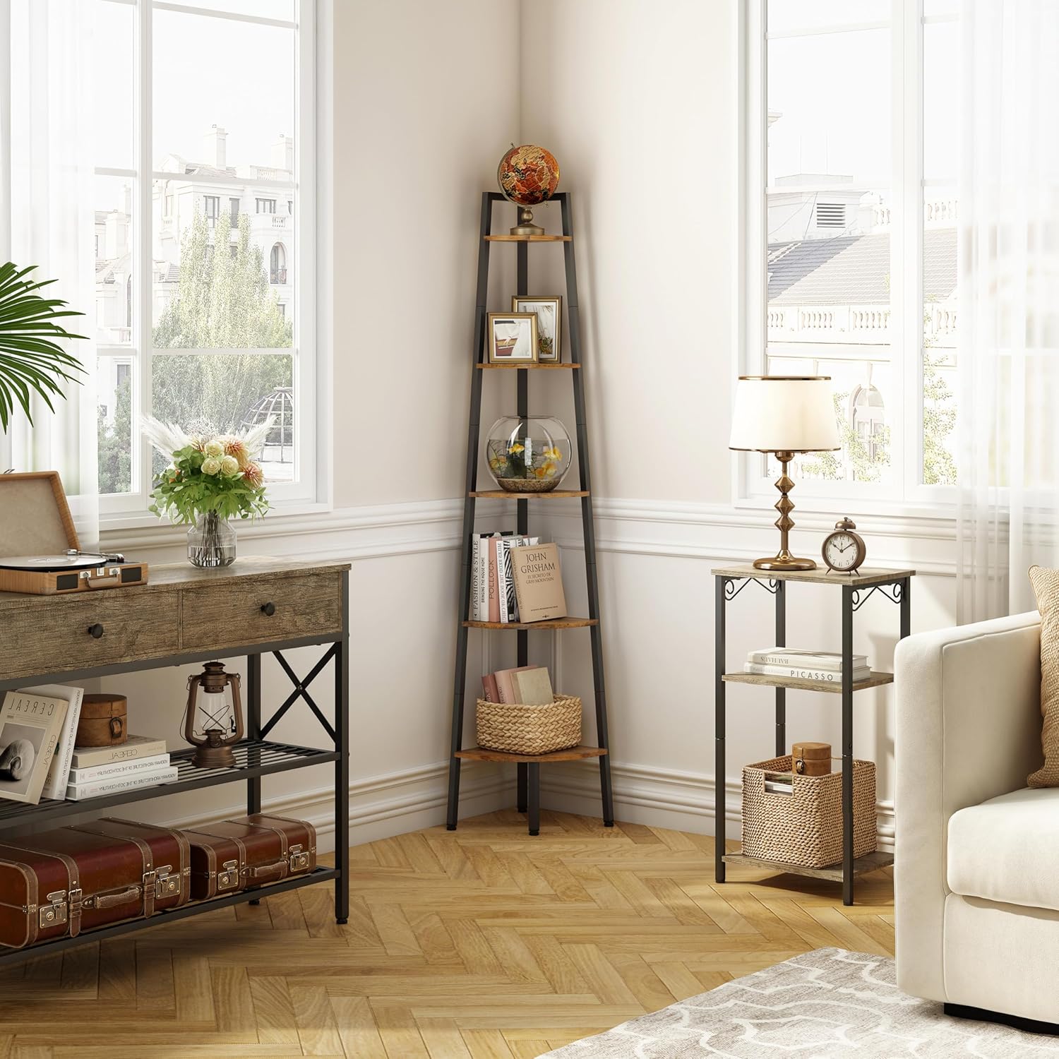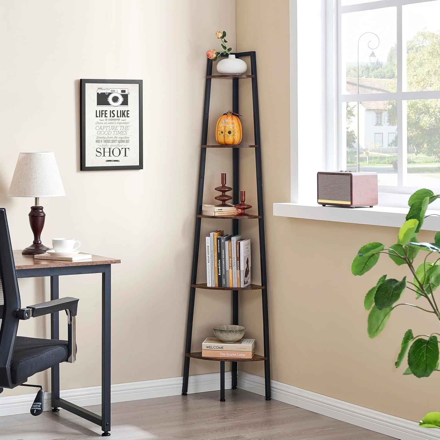 - Industrial and Fashion Design: The 5-tier ladder corner shelf combines the charm of classic and modern furniture styles. Meet your needs and create a calm and fresh atmosphere for your room. This shelf stand which combines decorative and functional purposes together