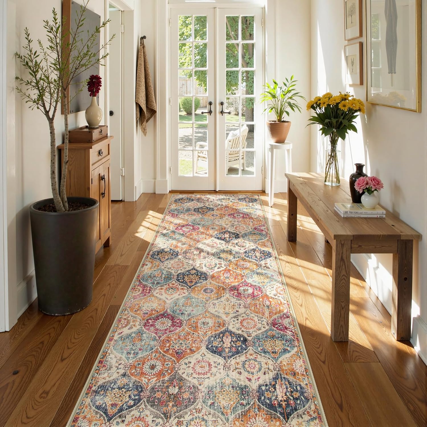 Lahome Moroccan Trellis Washable Runner Rug, 2x6 Kitchen Runners for Hallways 6 Feet Non Slip, Vintage Laundry Room Rug Ultra-Thin Long Carpet for Bathroom Bedroom Entryway, Cream/Multi