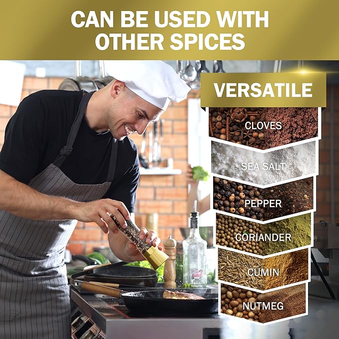 - Kitchen Must Haves and Wedding Registry Items: This beautiful salt and pepper grinder set is not only a practical kitchen accessory but also a stylish kitchen dΓ©cor item to accent the kitchen with gold accessories. Made of premium materials, the adjustable grinders allow for fine to coarse grinding and make a great addition to any wedding registry. Elevate your cooking game and add a touch of sophistication to your kitchen with this elegant and functional grinder set.