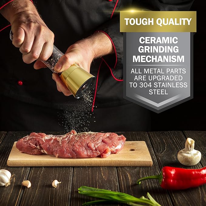 - HIGH QUALITY GLASS - BRUSHED GOLD SALT AND PEPPER MILL SET : Home EC Salt and Pepper Mills are easy to grip and made of the highest grade non-corrosive, brushed Stainless Steel, and BPA Free glass bottle. This Gold salt grinder and Gold pepper grinder set is a modern, classy and user friendly addition to your kitchen. Perfect for a gourmet meal or dinner party. Great gift or party favor! *SALT AND PEPPER NOT INCLUDED.