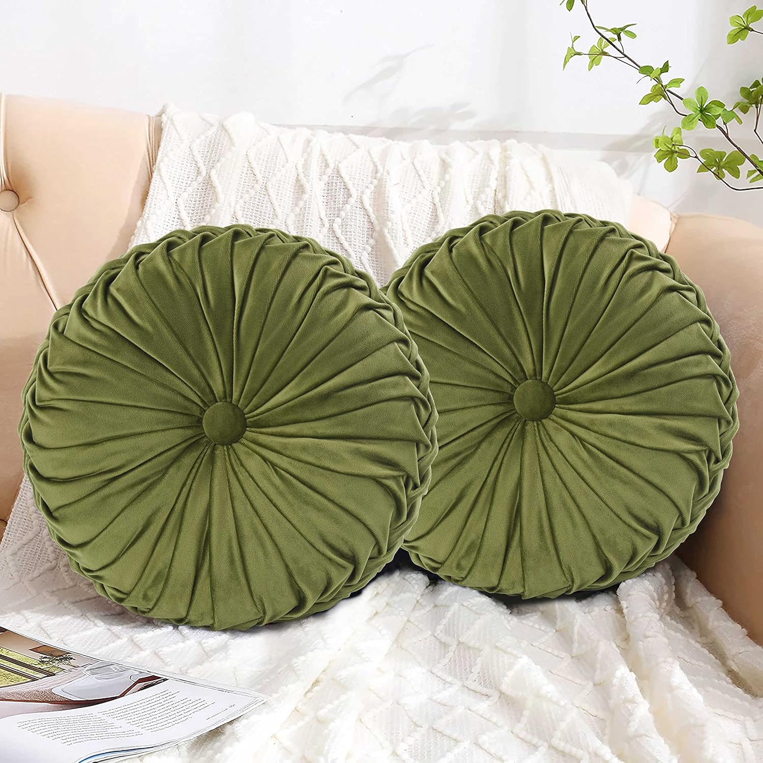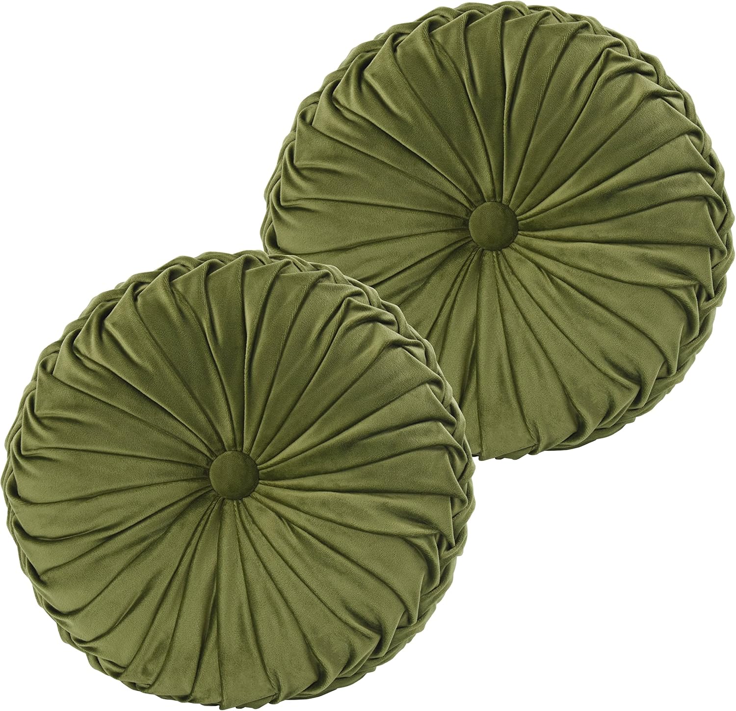 HIG Set of 2 Decorative Round Pleated Throw Pillows, Classy Accent Pumpkin Throw Pillows with Center Button, Vintage Velvet Floor Pillows for Sofa Couch Vanity Chair Bed, Olive, 14.5" Diameter(Ripple)