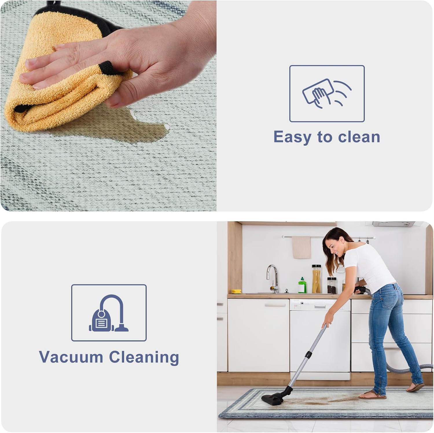 - Easy Clean & Waterproof: The cushioned kitchen carpets is stain resistant,waterproof and easily cleaned.Simply wipe the floor mat with a damp cloth or sponge or use a hand-held vacuum as needed,save your time and energy