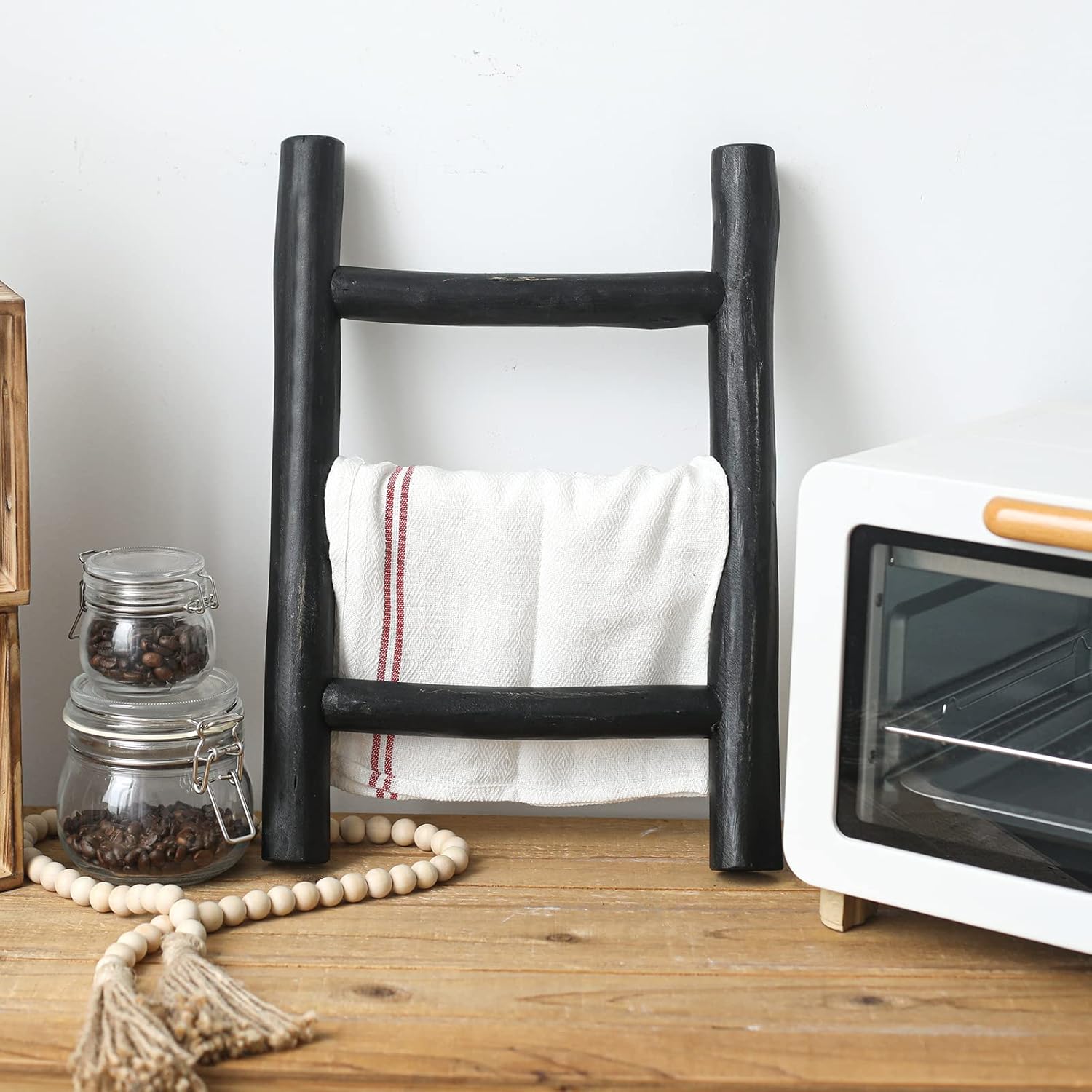 FUIN Fully Assembled Wooden Tea Towel Ladder, Mini Ladder Towel Rack Display Hanger, Small Rustic Farmhouse Tea Towel Stand Holder for Country Bathroom Decor, Black
