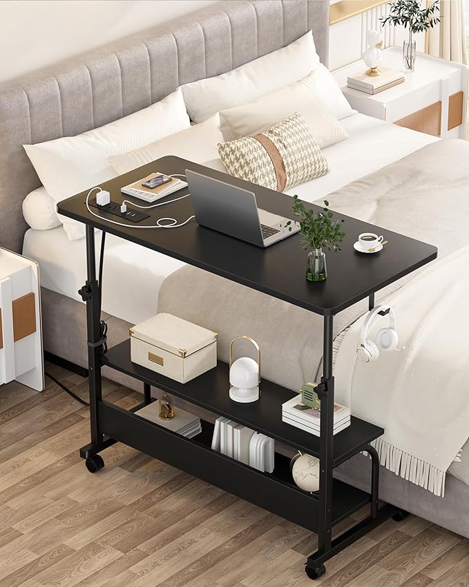 - 【Multi-Function】The rolling computer desk equipped with 4 high-quality smooth rotary wheels and non-slip footpads, you can move the desk wherever you want or fixed in one place, it offers stable moving and fantastic working experience. 2 tier opening storage shelves are convenient for you to place daily necessities and other items. Two extra desk iron hooks can save the most of your space.
