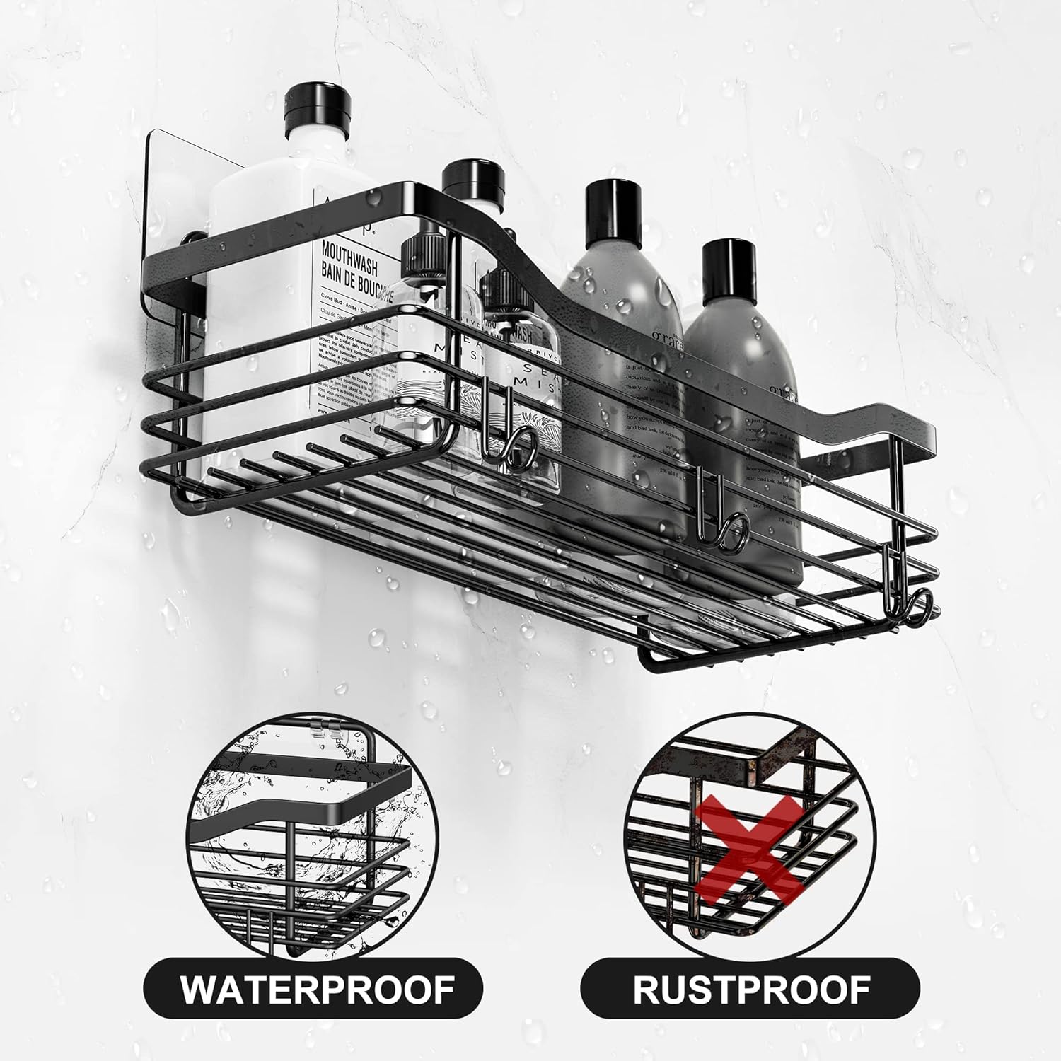 Orimade Shower Caddy Basket Shelf Storage Rack, No Drilling Wall Mounted Adhesive Rust Proof Stainless Steel Shower Organizer with 5 Hooks for Bathroom, Black 2 Pack