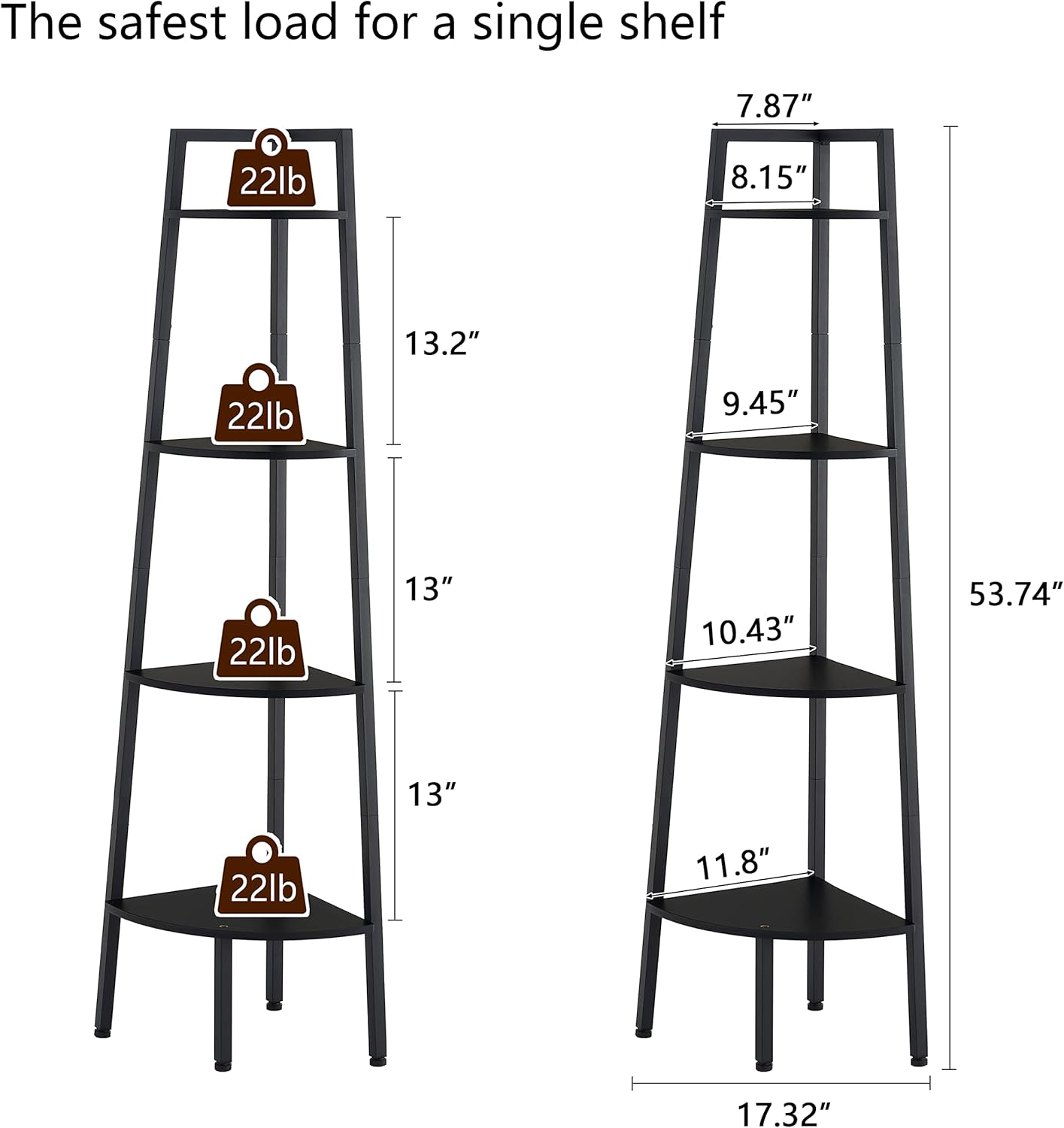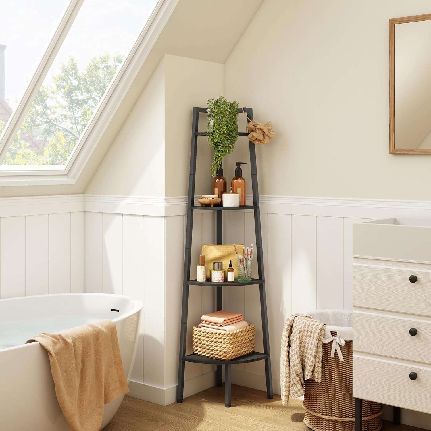 - ăIndustrial and Fashion DesignăThe 4-tier ladder corner shelf combines the charm of classic and modern furniture styles. Meet your needs and create a calm and fresh atmosphere for your room. This shelf stand which combines decorative and functional purposes together.